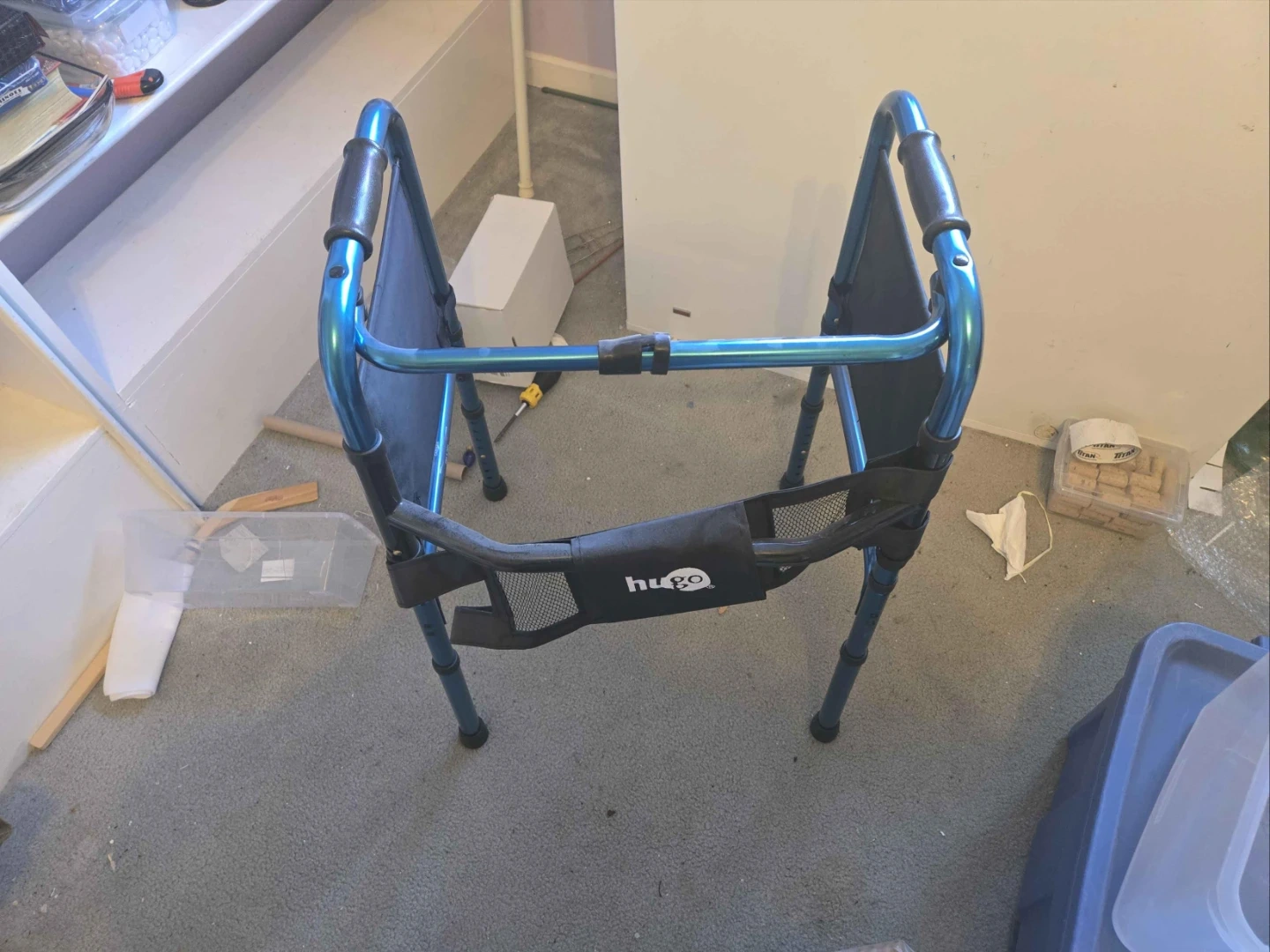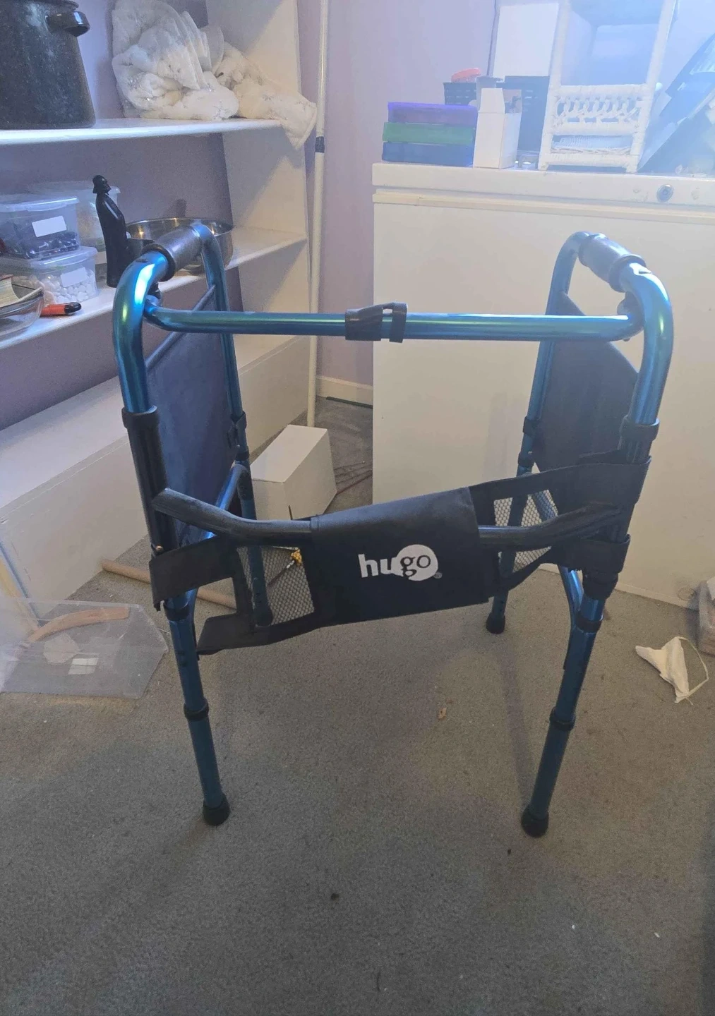 This is a Hugo brand folding walker in a bright blue colour. It features comfortable hand grips and a handy storage pouch. It's designed for easy portability and everyday use.