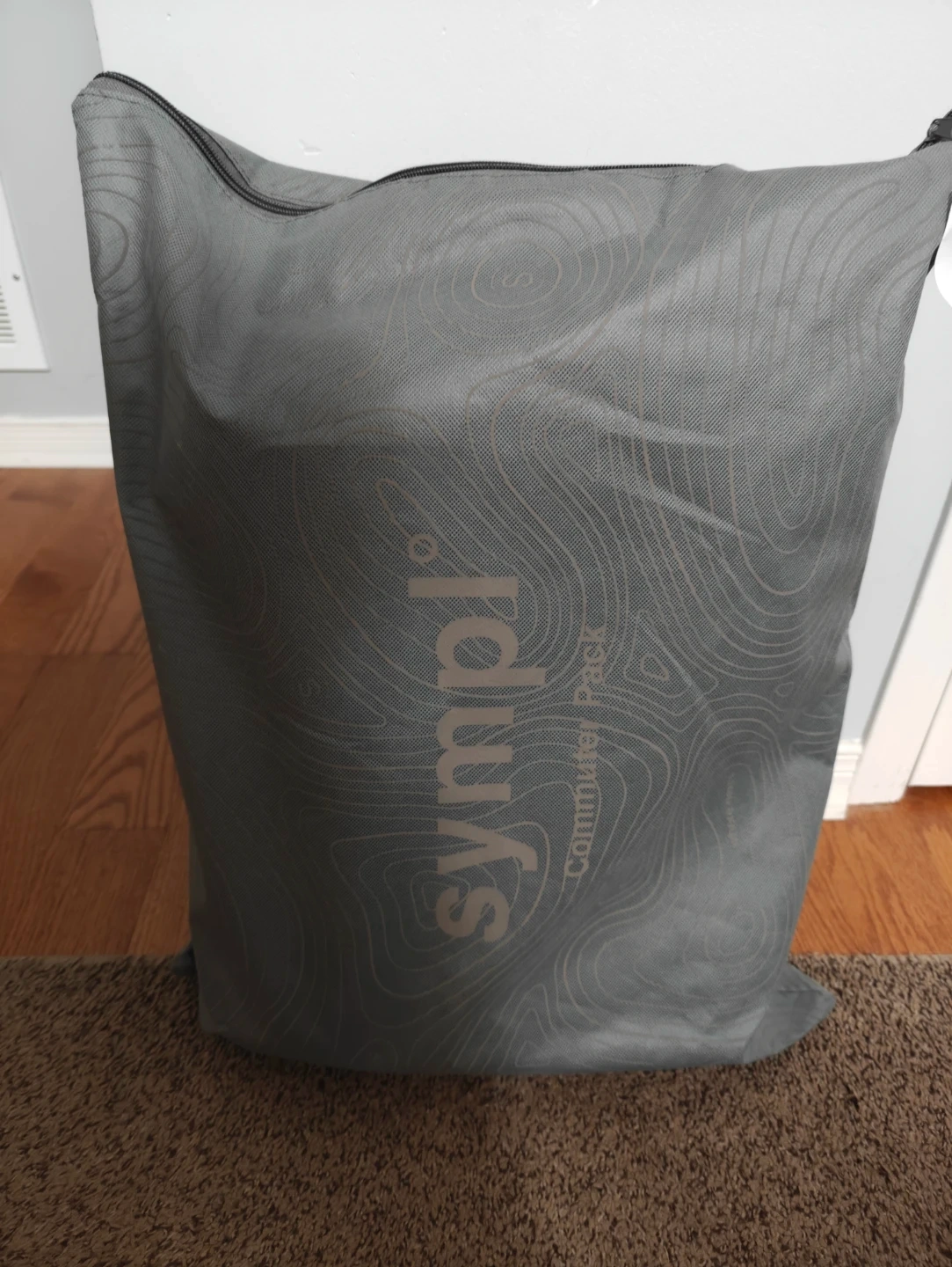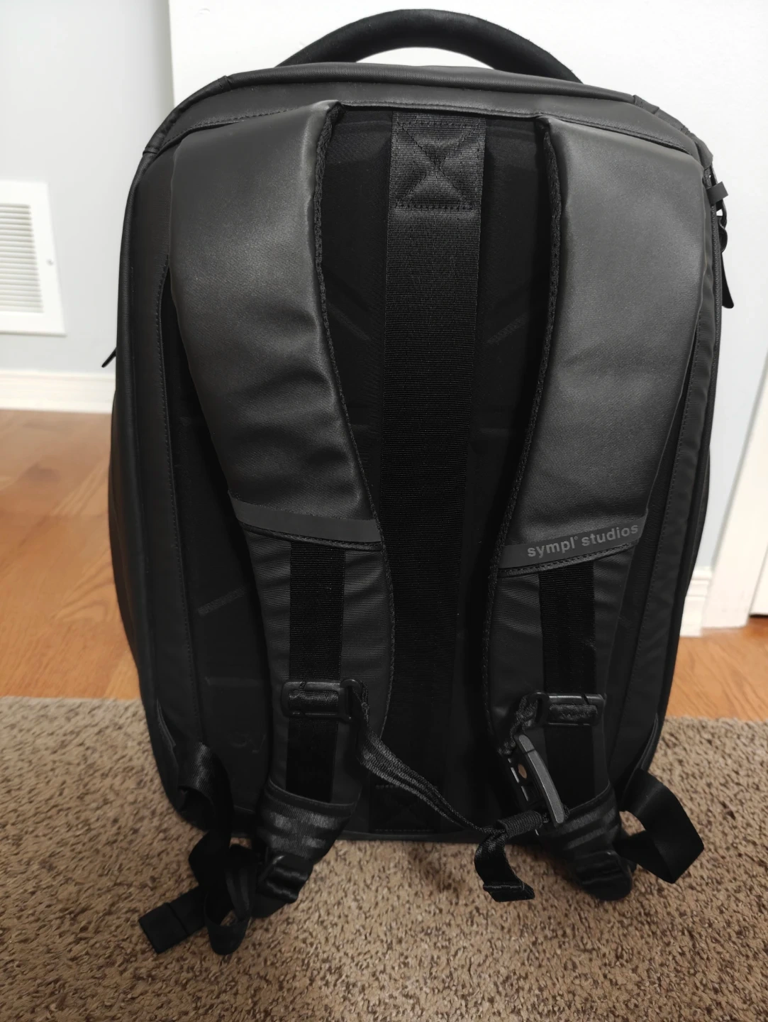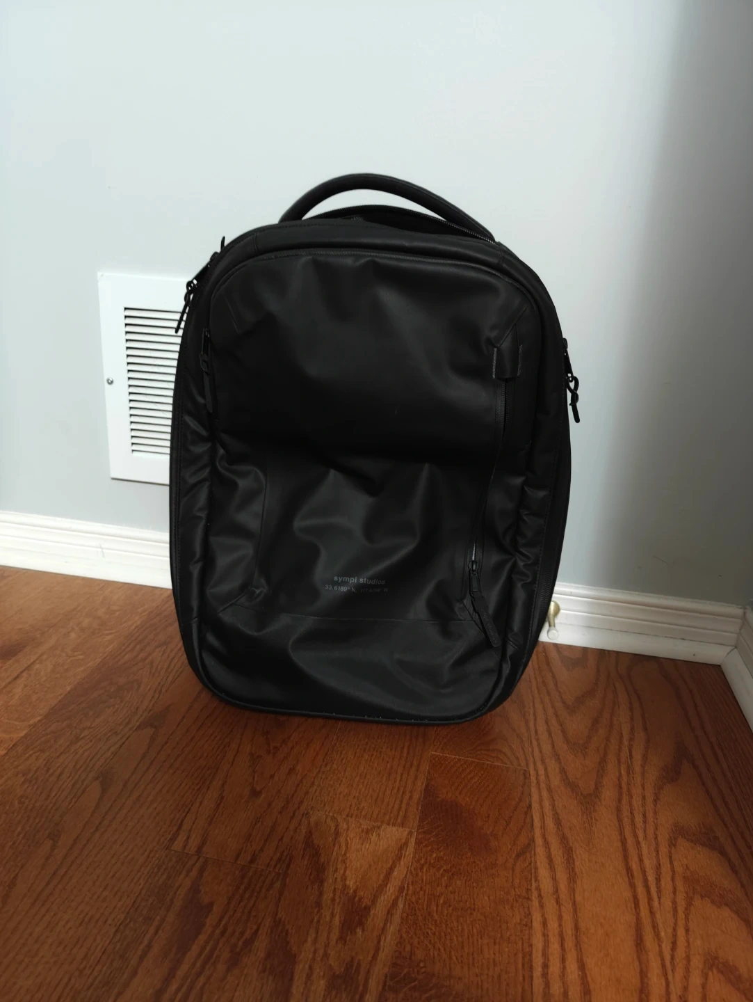 This is a black Sympl Studios Commuter Pack backpack. It features multiple interior pockets and organizational compartments. The backpack also includes its original storage bag. Super comfortable, can fit more than you think into the main compartment!