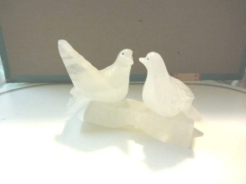 Pretty pair of frosted onyx bird sculptures facing each other, possibly representing love birds. The material is opaque/frosted, almost white, and glossy. Each sculpture measures approximately 5.5" wide by 3.5" high. This is a heavy item. The age, maker, and place of origin are unknown. It's a nice little mantle sculpture that can bring an atmosphere of tranquility and quaintness to your home. Feel free to message if you have any questions!