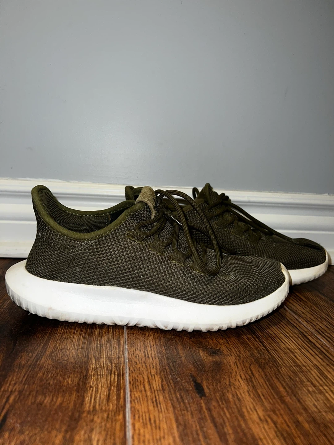 These Adidas Tubular Shadow sneakers are a stylish olive green colour. They feature a breathable mesh upper and a comfortable sole. Perfect for everyday wear!
