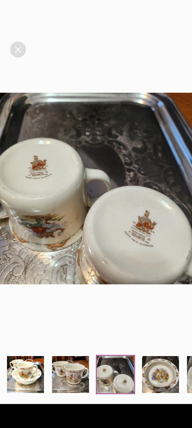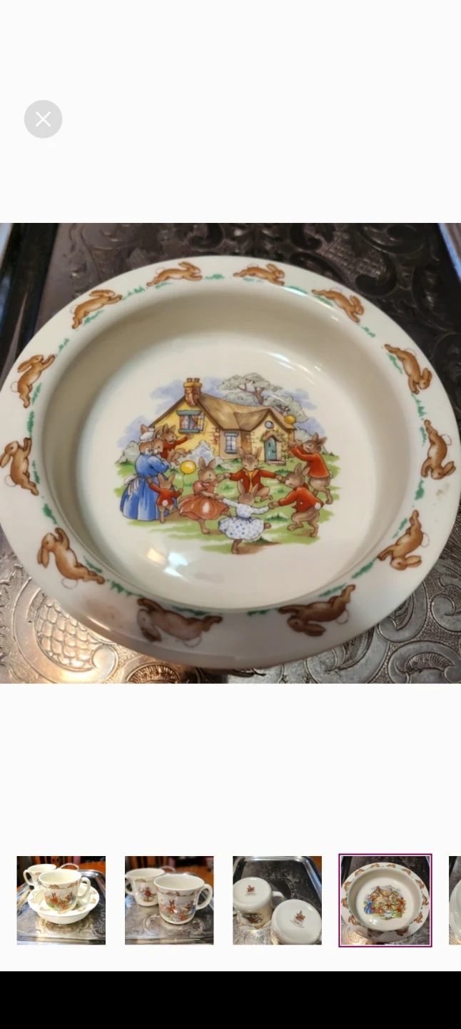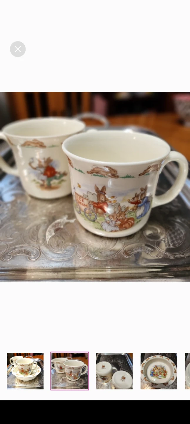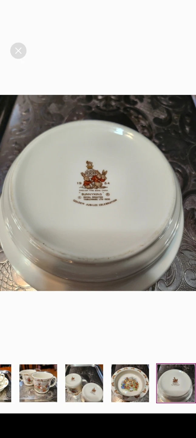This is a Royal Doulton Bunnykins Golden Jubilee Celebration set. It includes a bowl and two mugs with adorable bunny designs. Perfect for collectors or anyone who loves a touch of whimsy! Vintage 1984.
