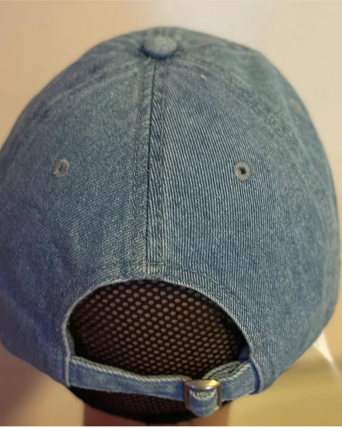 Denim baseball cap with the Cancer constellation embroidered on the front. It's a light blue wash with an adjustable strap and metal buckle. The back features a mesh panel for breathability.