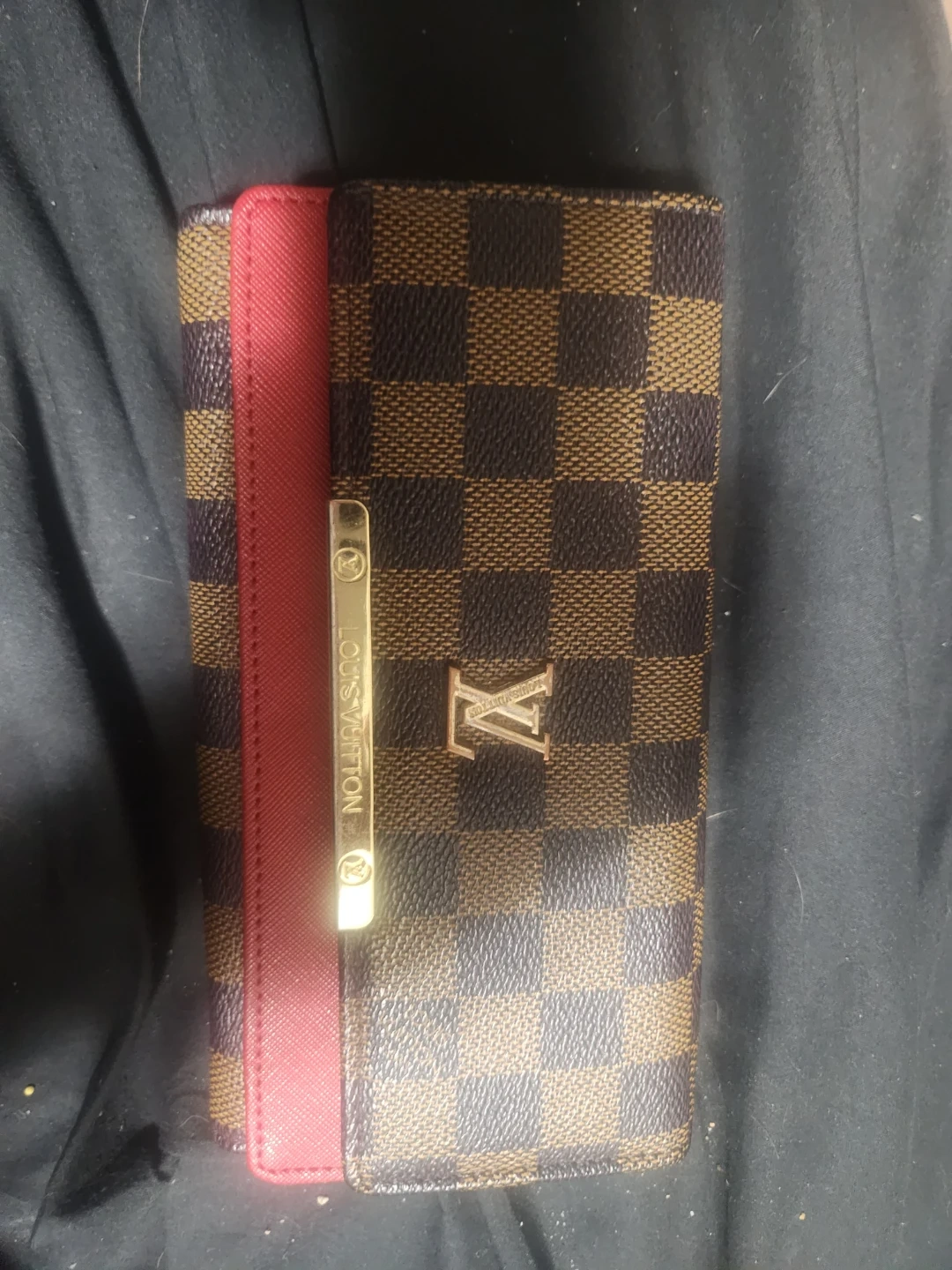 This is a Louis Vuitton wallet in the Damier Ebene pattern. It features a contrasting red trim detail. This wallet is perfect for carrying your essentials in style.