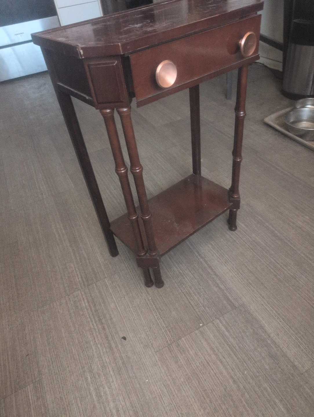 This is a dark wood accent table with a single drawer. It has decorative turned legs and a lower shelf for extra storage. The drawer hardware is copper-toned.