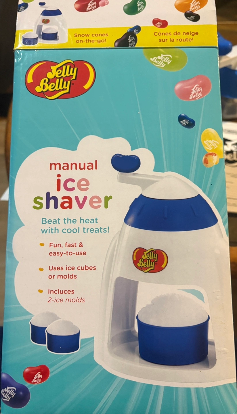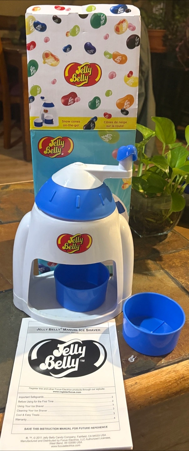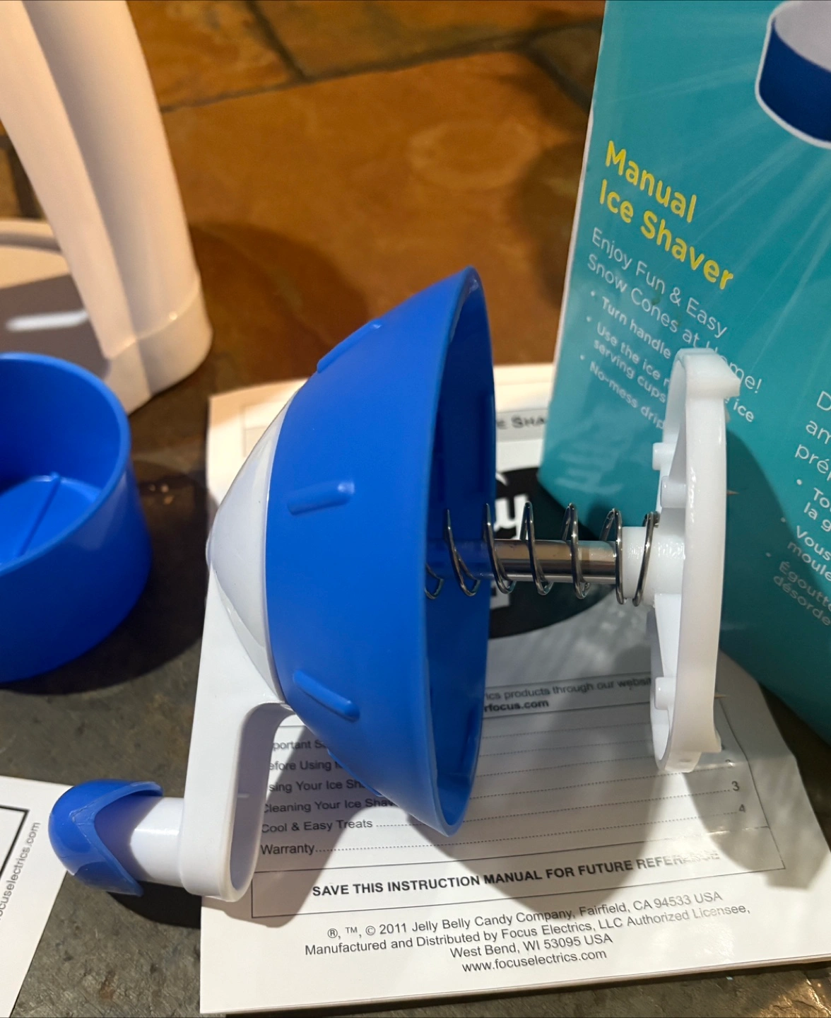 Here is a manual ice shaver. Comes with an instruction manual. The colours are white and blue, with a container to catch the shaved ice. This would be great for making yourself a refreshing treat on a hot day.