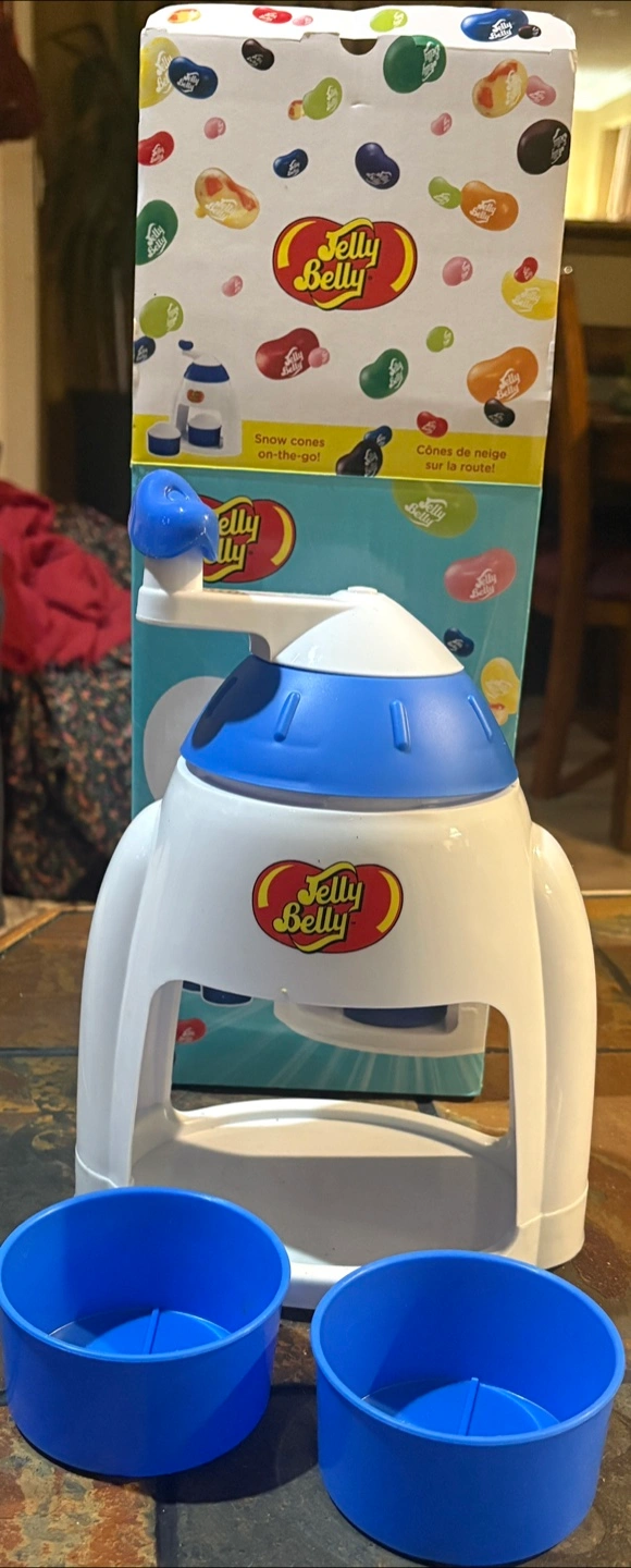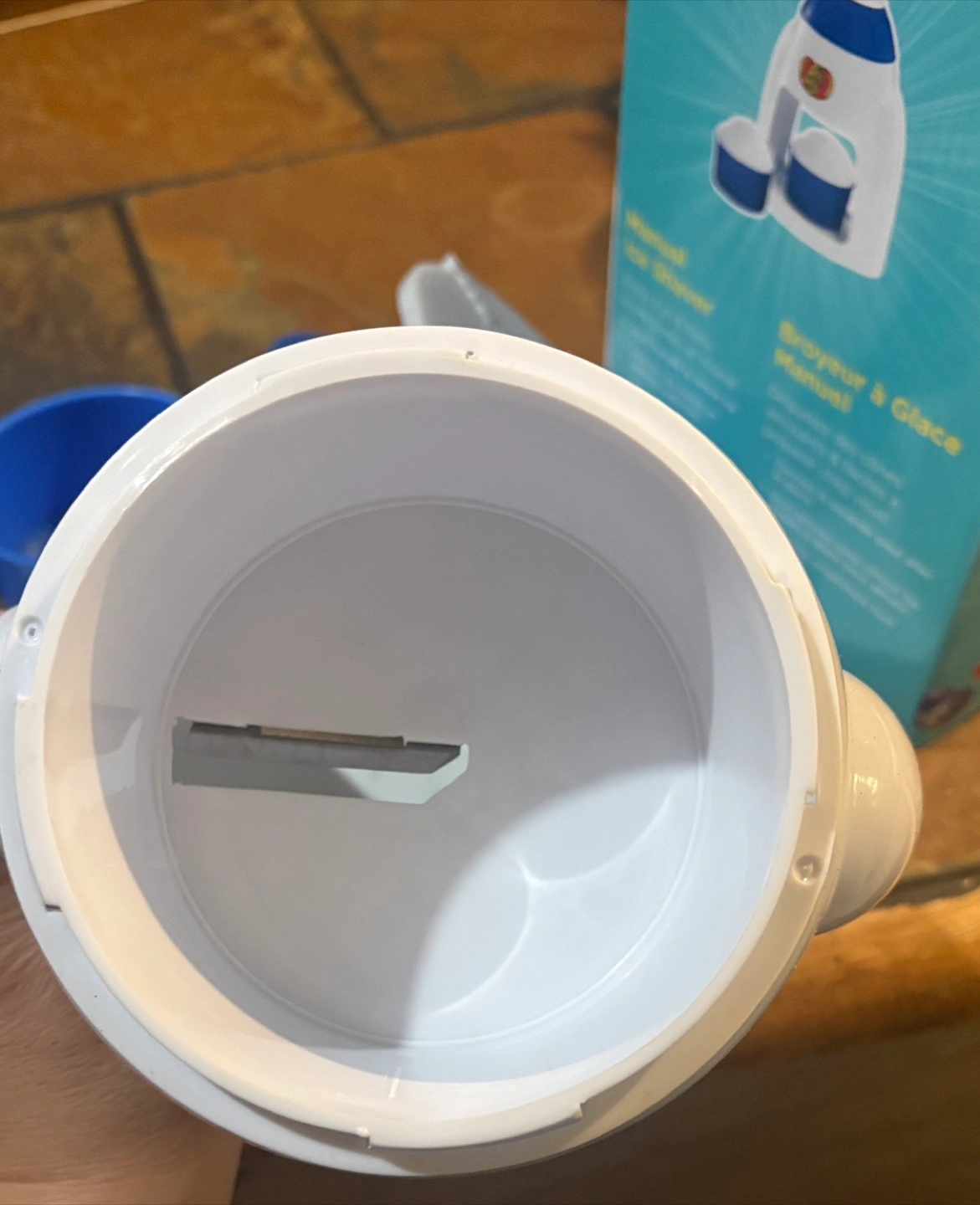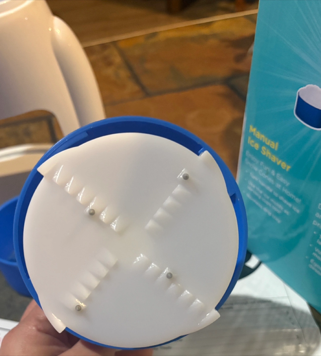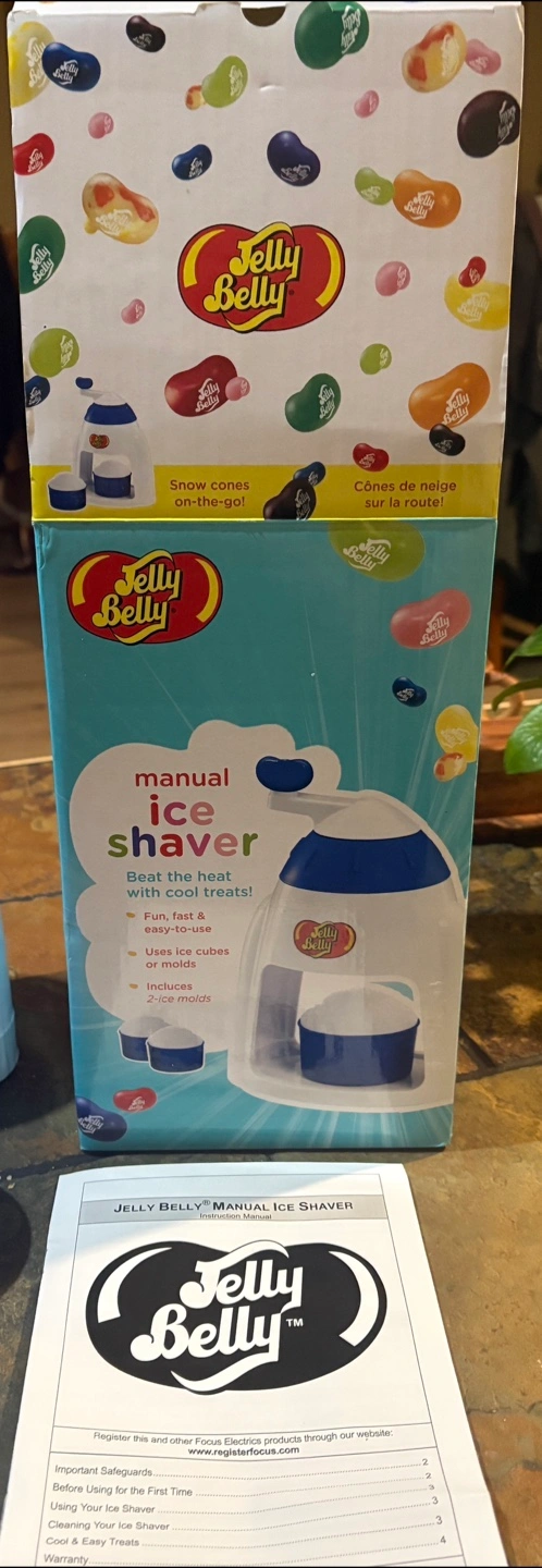 Here is a manual ice shaver. Comes with an instruction manual. The colours are white and blue, with a container to catch the shaved ice. This would be great for making yourself a refreshing treat on a hot day.