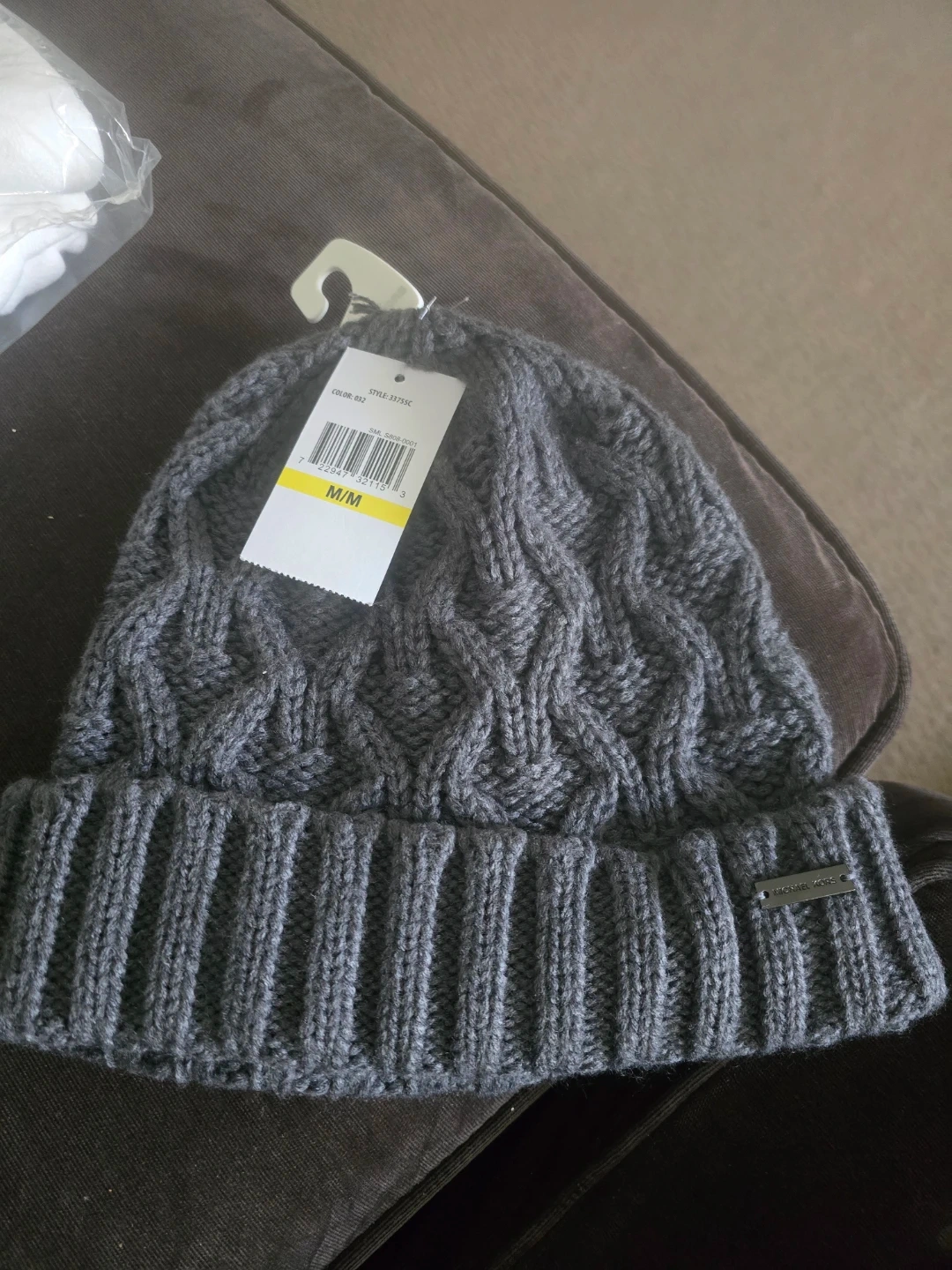 This Michael Kors beanie is a stylish grey colour with a classic cable knit pattern. It's size M/L and made from a soft material. Keeps your head warm on chilly days!