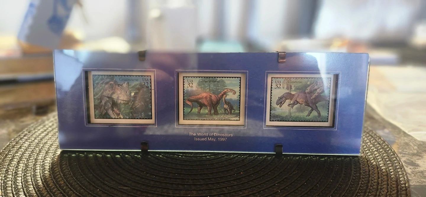 It includes three USA 32 cent stamps depicting different dinosaur species.