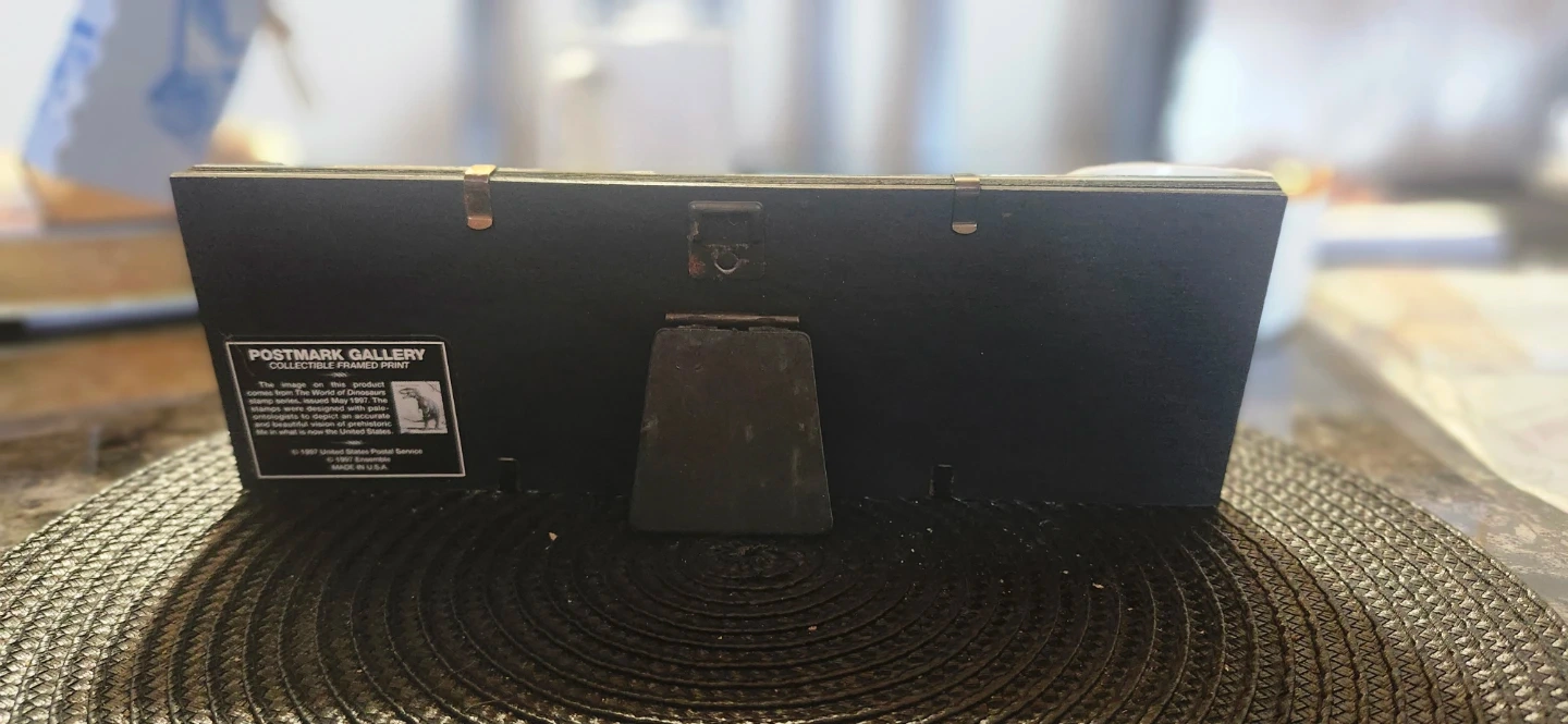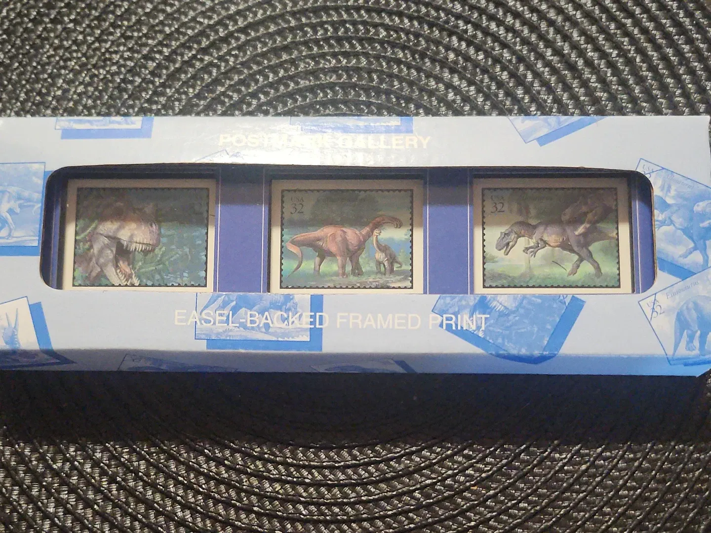 This is a Postmark Gallery easel-backed framed print featuring "The World of Dinosaurs". The stamps shown were issued in May 1997.