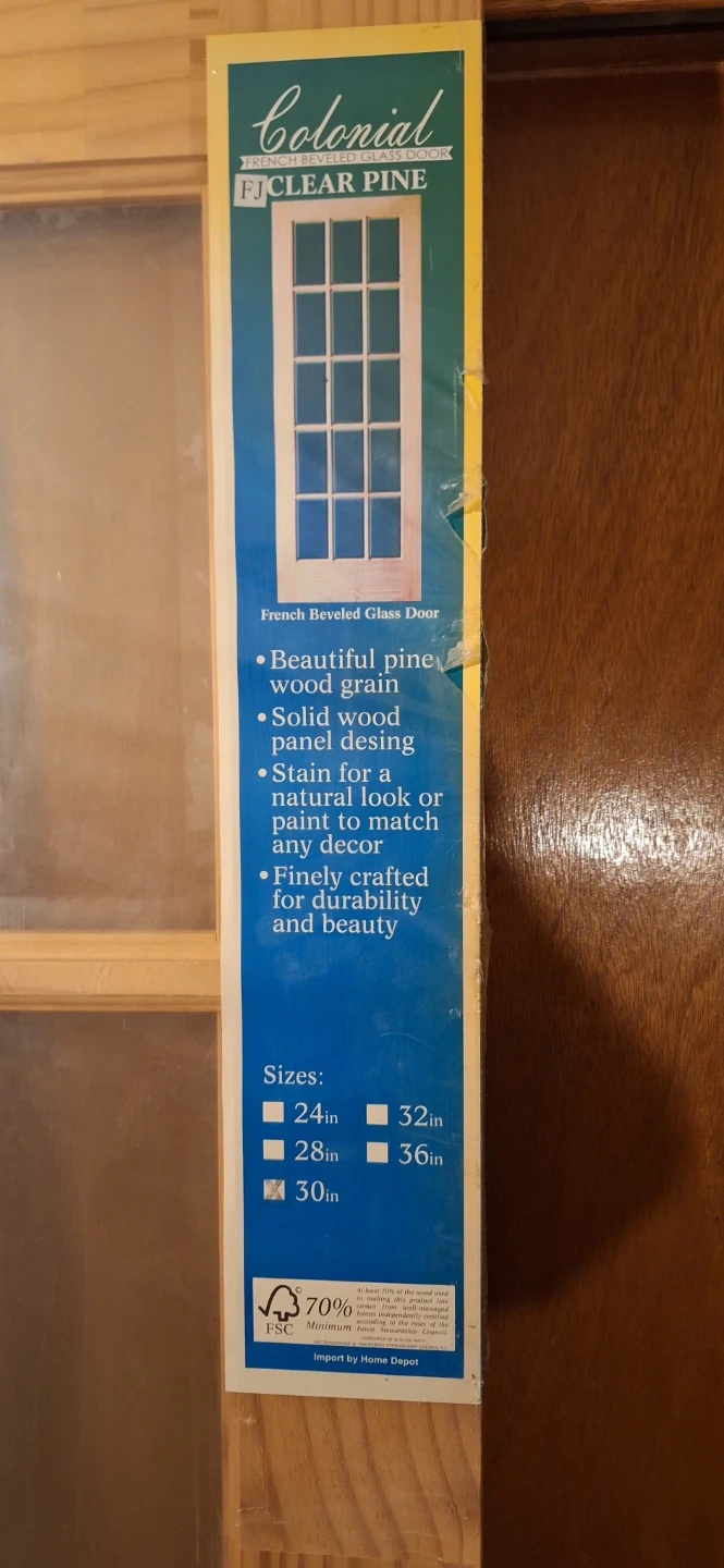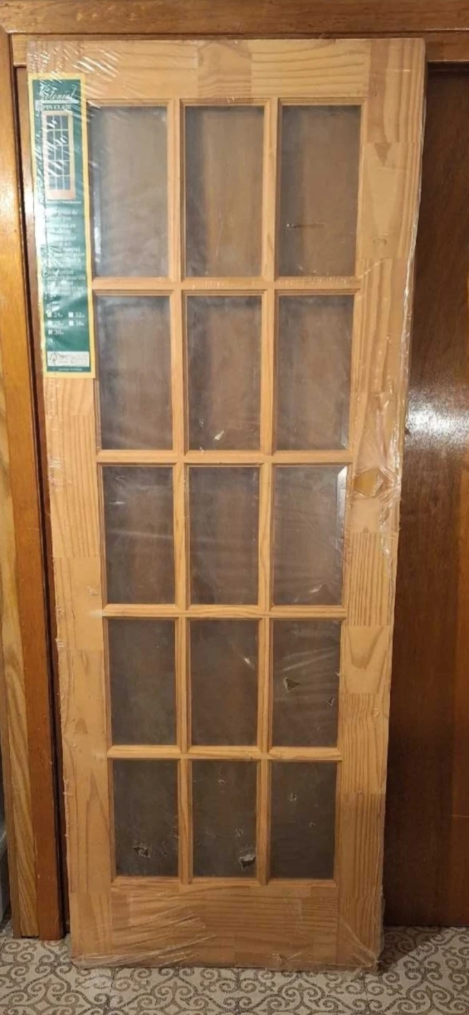 Beautiful pine wood grain on this French bevelled glass door. Solid wood panel design can be stained to match any decor. It's finely crafted for durability and beauty. Thickness 1-3/4 inches.