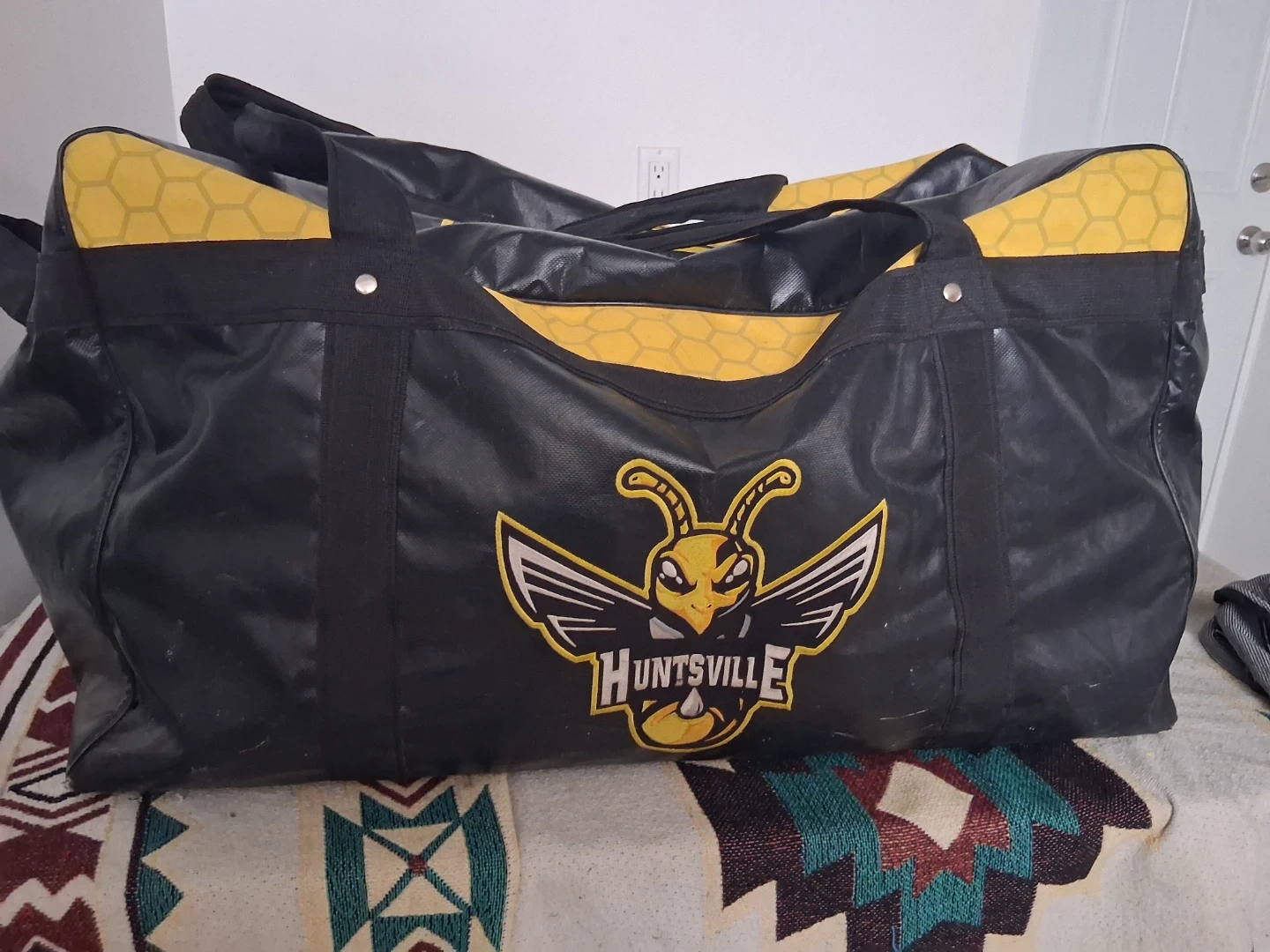 Large black and yellow duffel bag with the Huntsville Hornets logo. It has sturdy handles and a durable exterior, perfect for sports gear or travel.