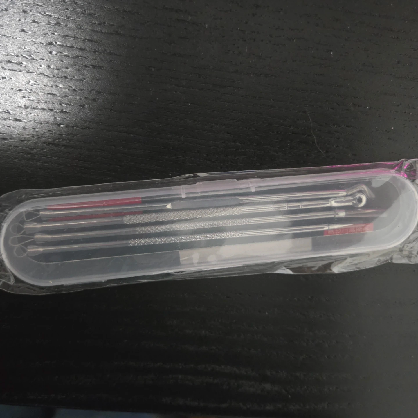 This is a stainless steel blackhead and pimple removal tool kit. It includes multiple tools for extracting blemishes. They're made of durable stainless steel.