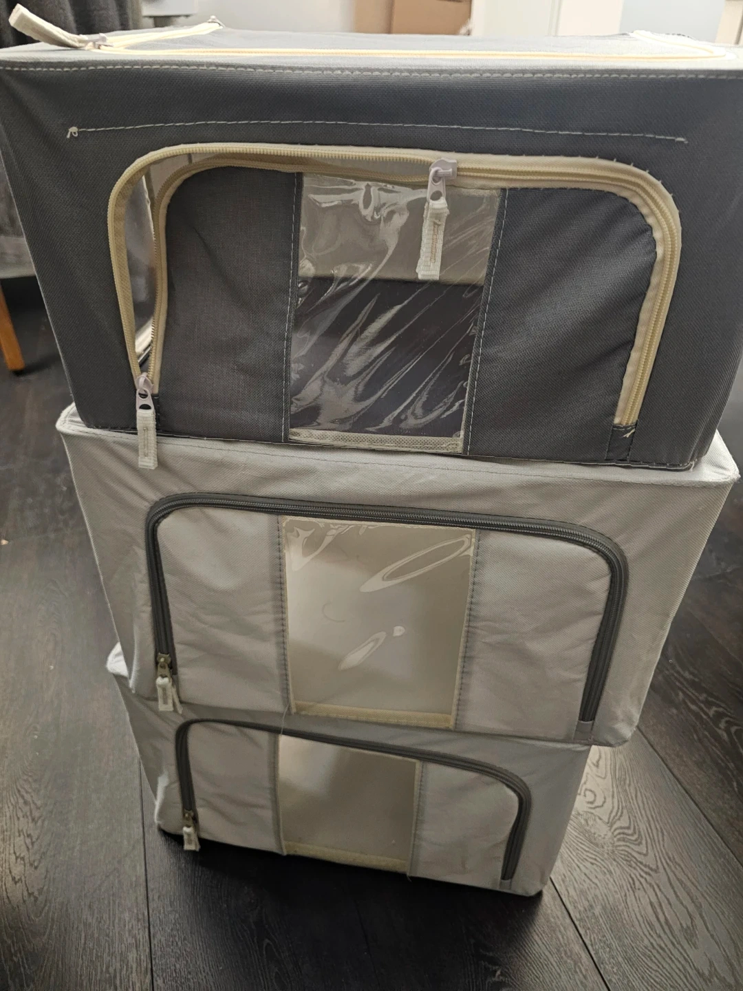 Set of three fabric storage boxes. Foldable and good size to put in your closet.