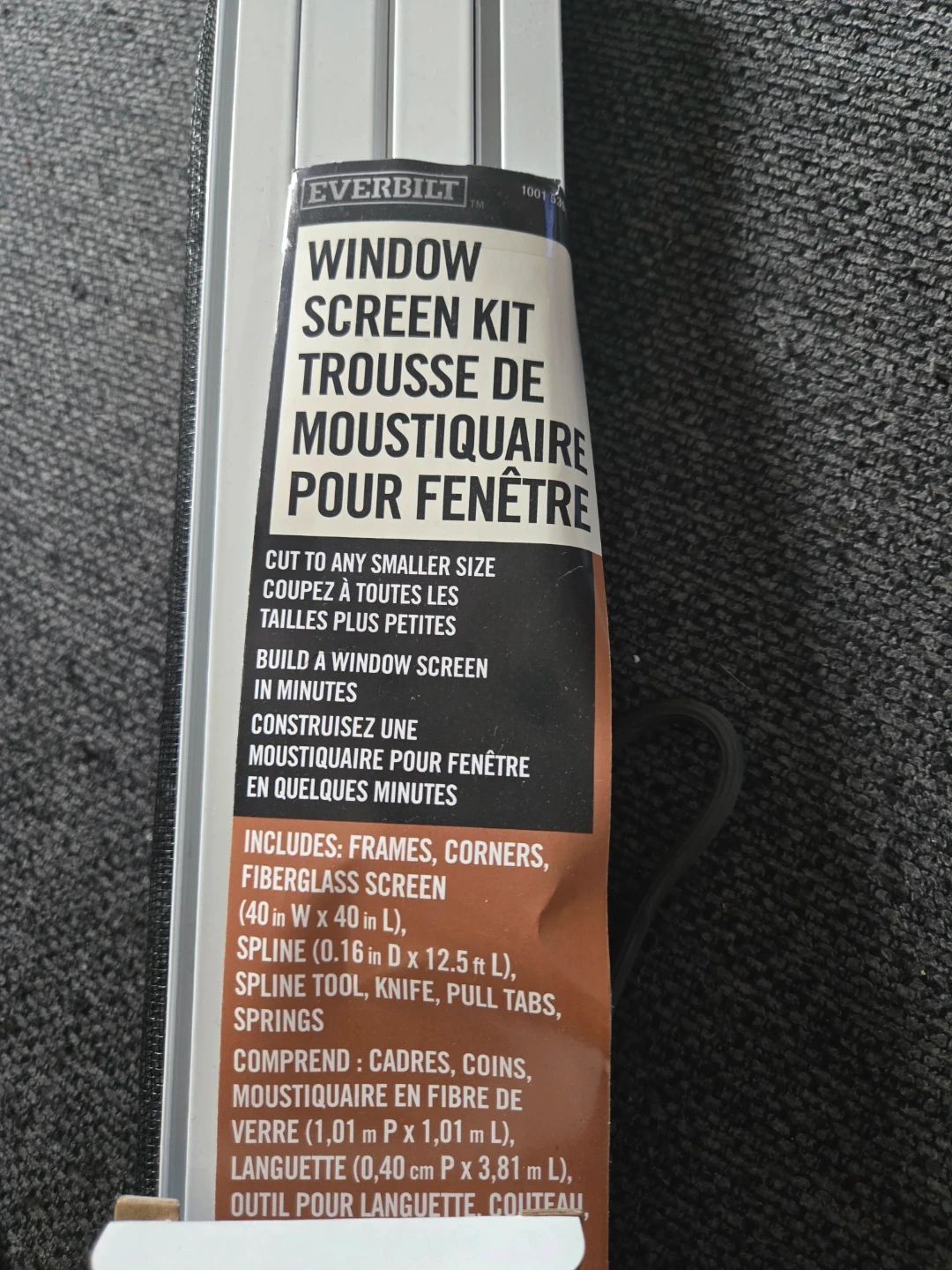 This is an Everbilt window screen kit for building your own screen. It includes frames, corners, fiberglass screen, spline, spline tool, knife, pull tabs, and springs. The screen is 40 inches by 40 inches and the spline is 12.5 feet long. It's cut to any smaller size and builds a window screen in minutes!