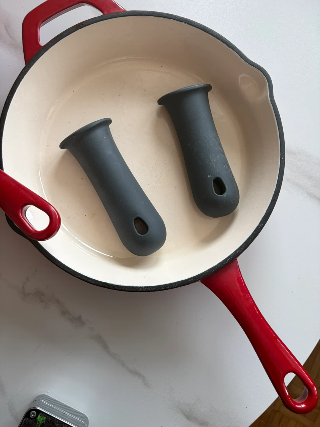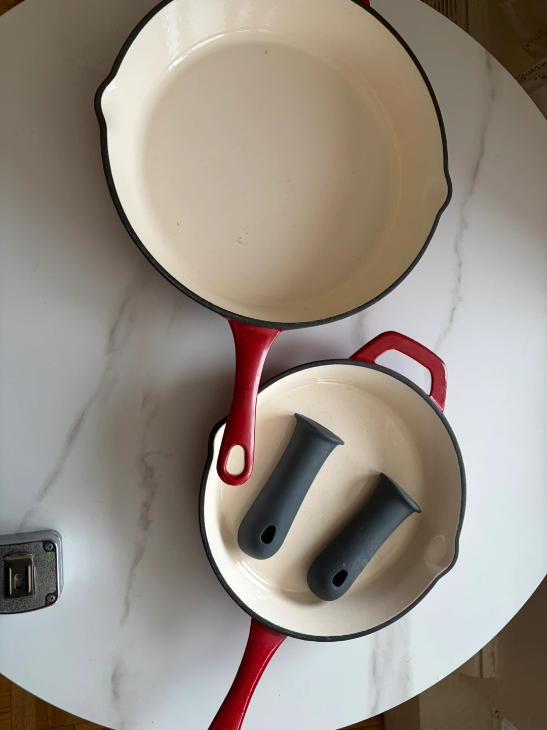 This is a Tramontina 10-inch and 12- inch enameled cast iron skillet set. They’re red on the outside with a cream-coloured interior. Two silicone handle covers are included. This skillet set is great for searing, sautéing, and baking! Used twice, they are too heavy for me. $30 each or both for $50