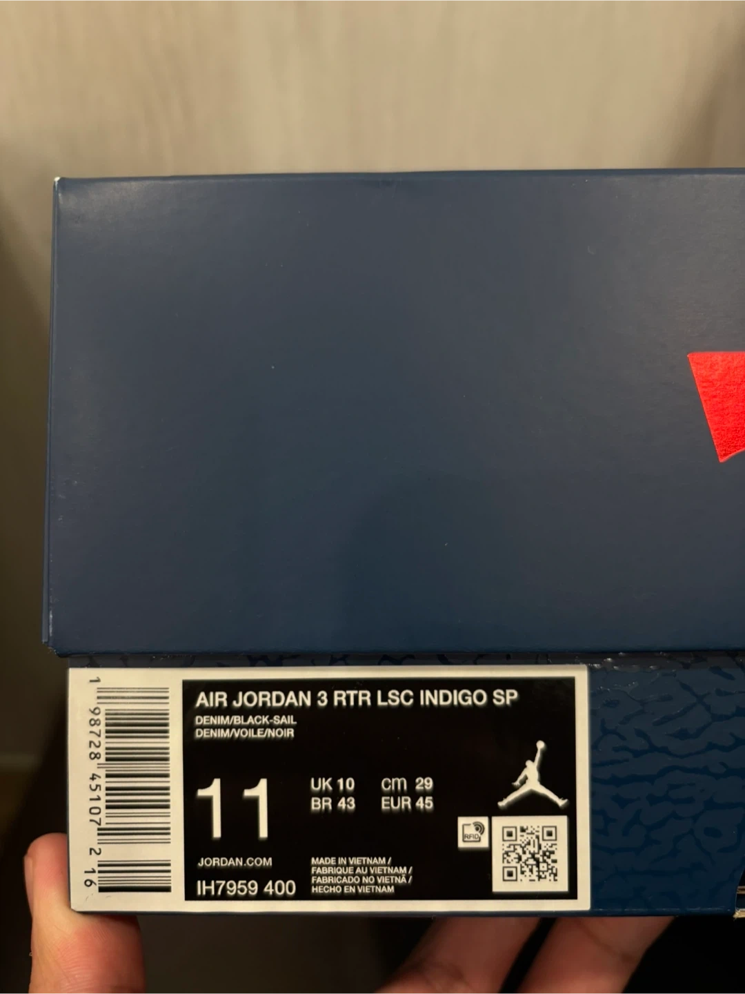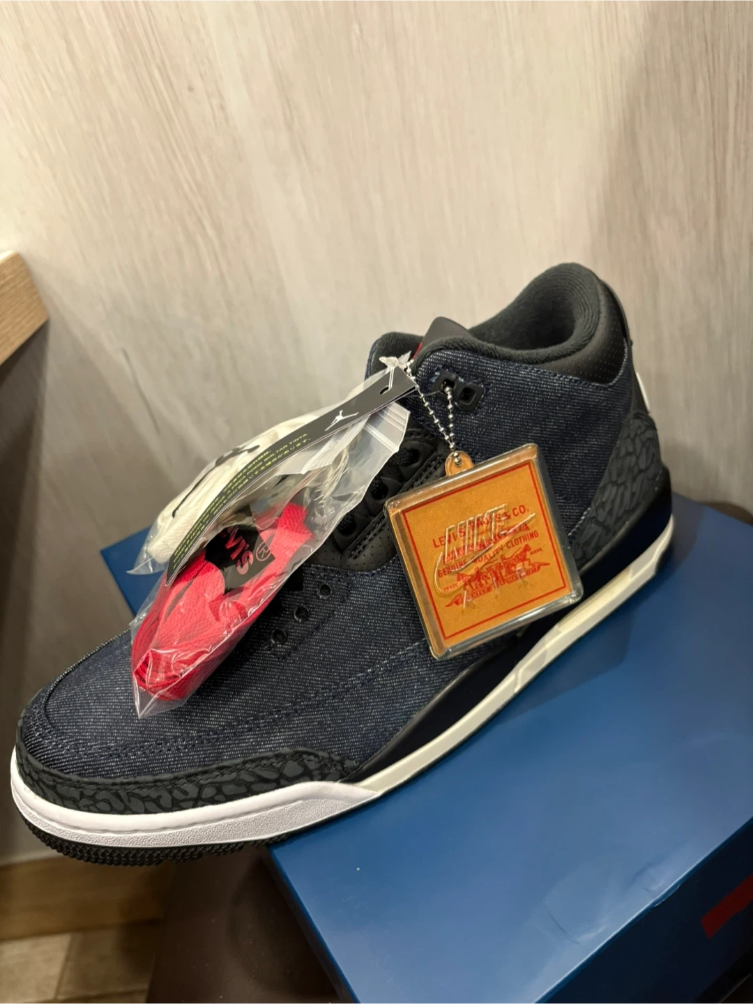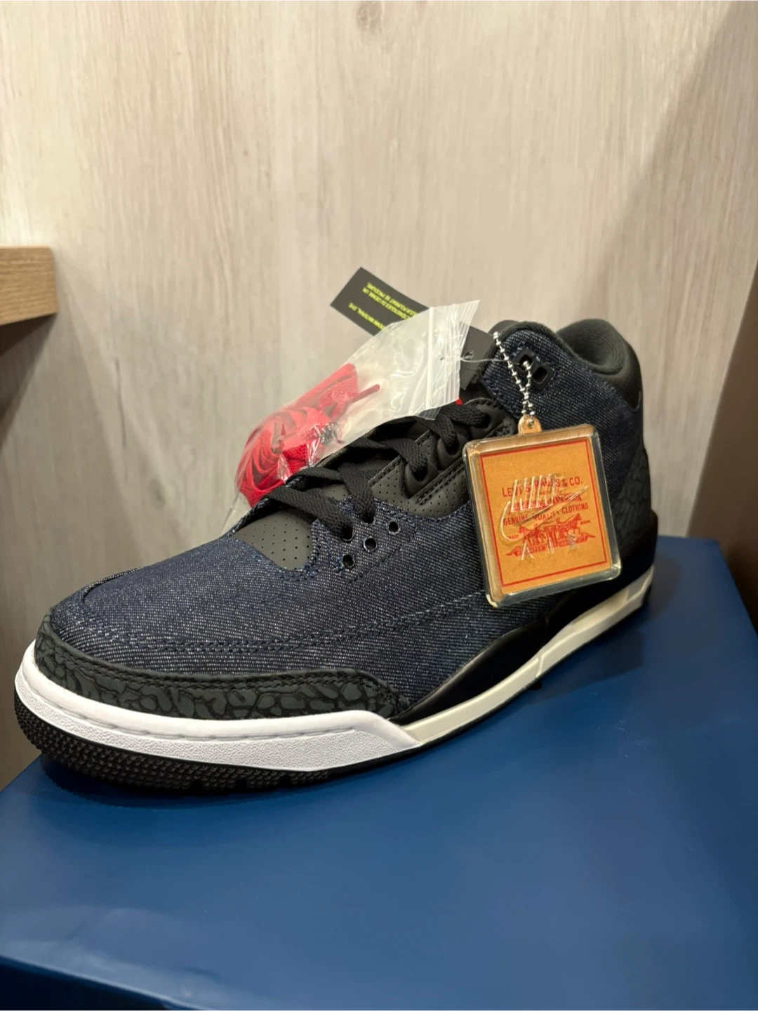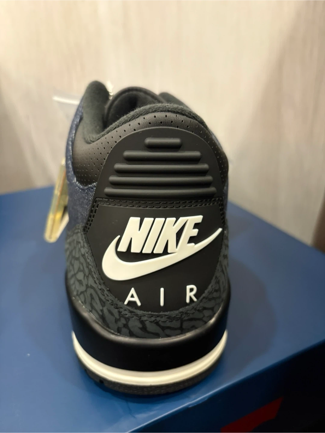 These Air Jordan 3 Retro SE shoes come in a denim and black colourway. They feature the iconic elephant print detailing. Includes original box and extra red laces.
