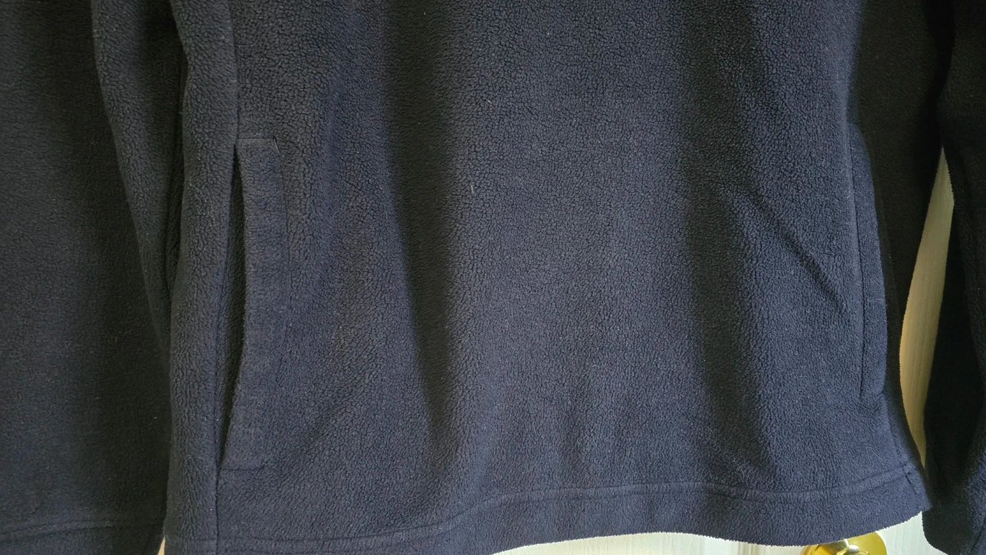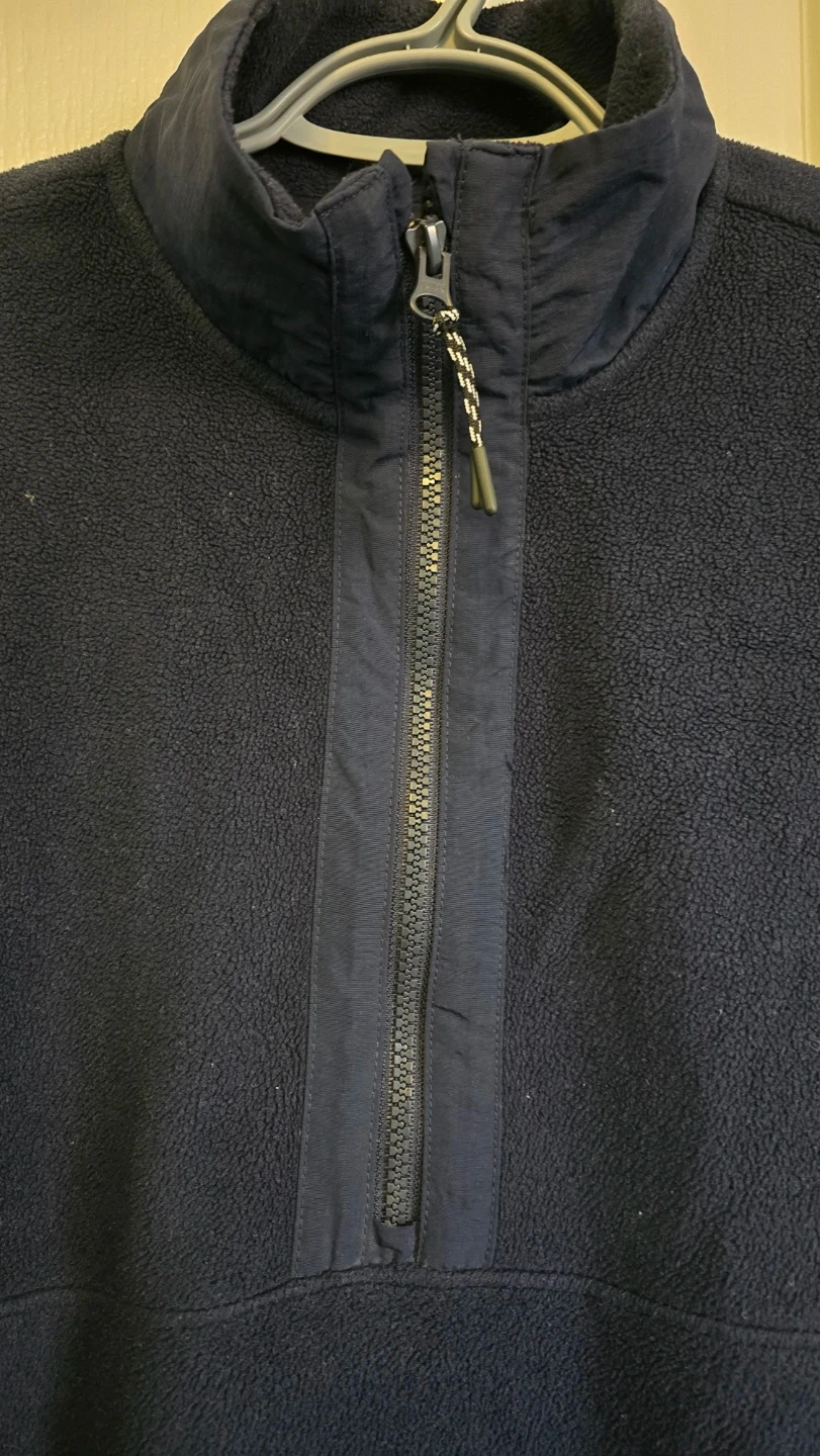 This is a navy blue fleece pullover sweater. It's a size small and features a quarter-zip closure. Two front hand pockets.