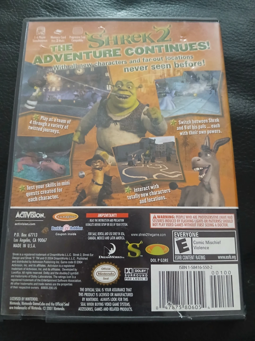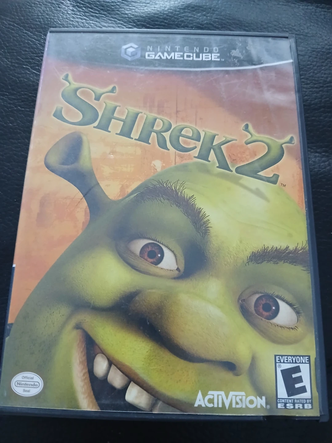 This is the Shrek 2 video game for the Nintendo GameCube. It includes the game disc and instruction booklet. The game allows players to play as a team and explore new characters and locations.