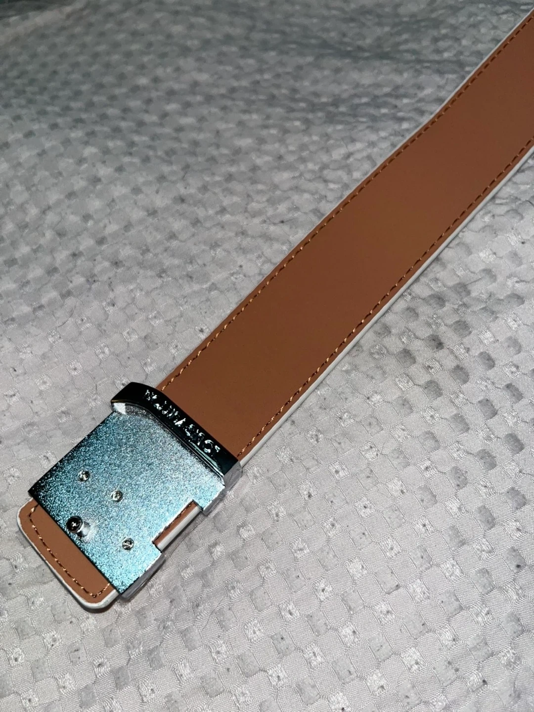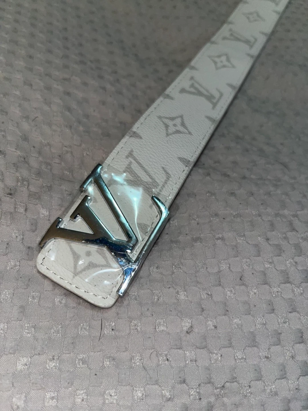 Selling a stylish Louis Vuitton belt in white leather. It features the iconic LV monogram pattern. The belt is in great condition and ready to elevate your wardrobe!