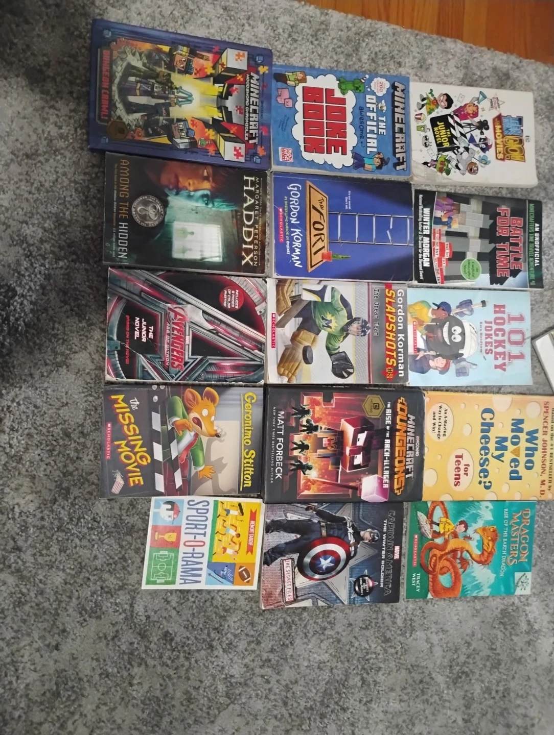 A collection of popular children's books including Minecraft, Marvel's Captain America, and Geronimo Stilton. Titles cover adventure, jokes, and fantasy themes. This assortment is great for young readers exploring different genres.