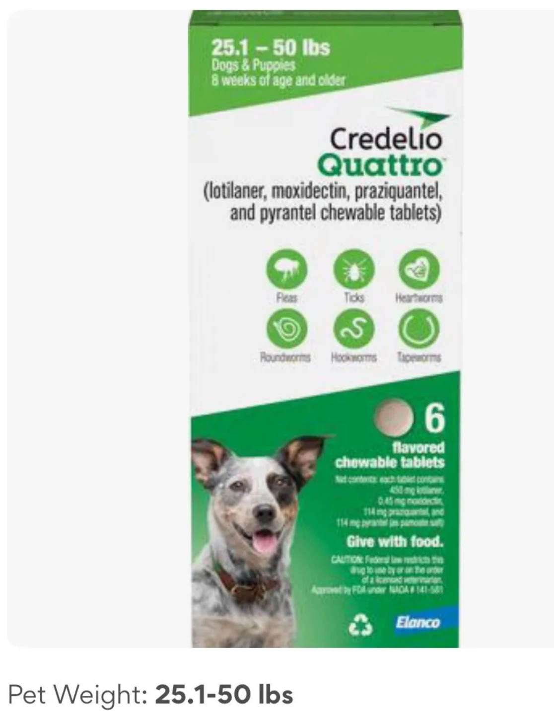 Credelio Quattro flavored chewable tablets for dogs and puppies 25.1-50 lbs. Contains lotilaner, moxidectin, praziquantel, and pyrantel. For fleas, ticks, heartworms, roundworms, hookworms, and tapeworms. Six tablets per box.