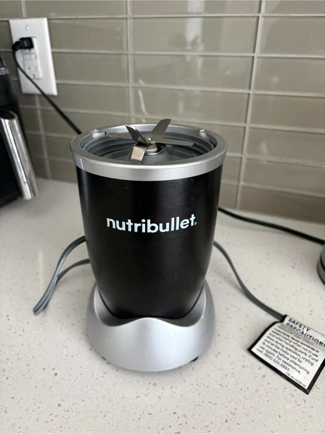 This is a black NutriBullet base unit. It's designed for personal blending tasks. The base has a silver trim and a black cup attachment area. Comes with the correct accessories.