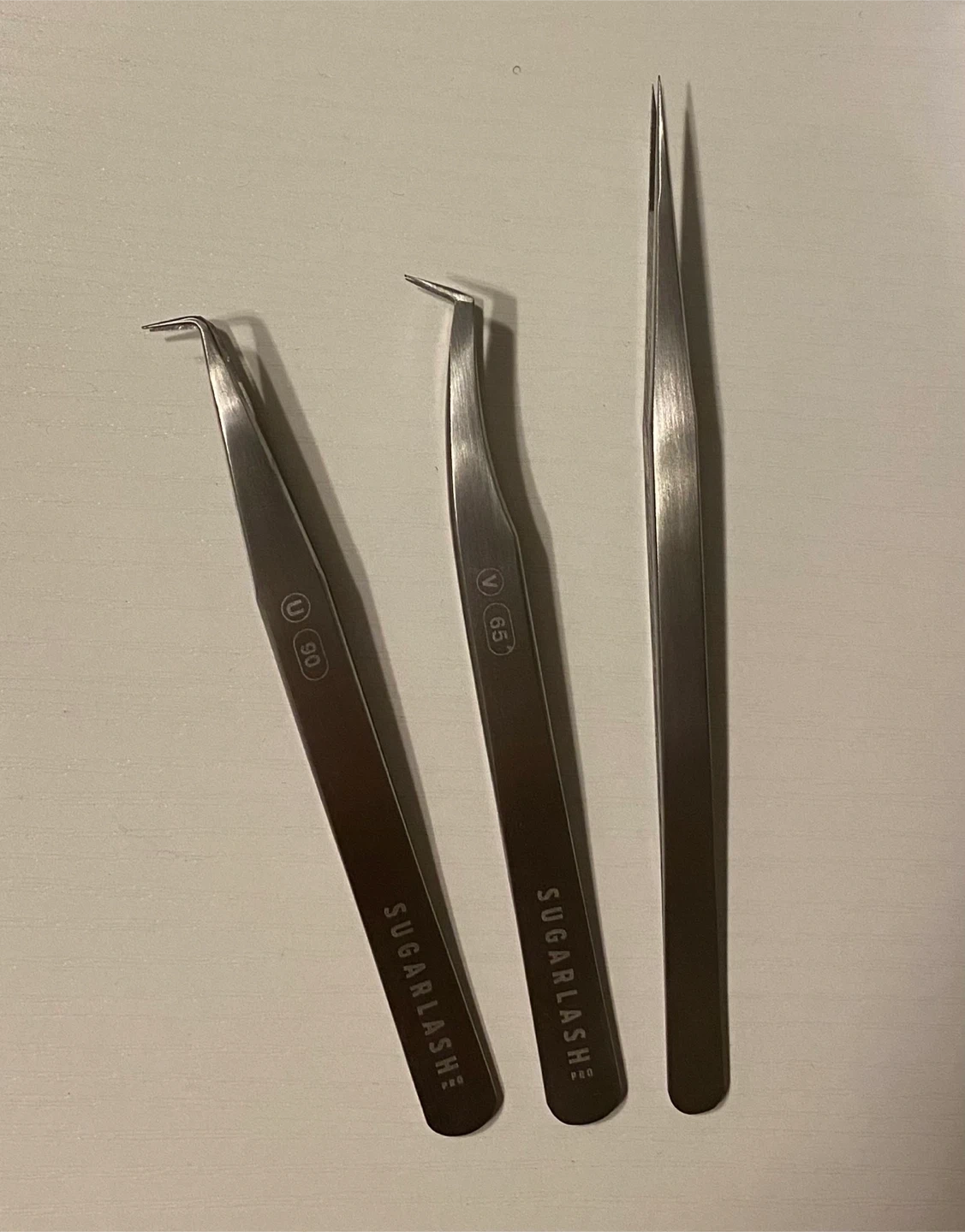 Set of three SUGARLASH eyelash extension tweezers. Includes a straight fine-tip tweezer, a curved fine-tip tweezer, and a volume tweezer. Stainless steel construction. These are great for precise lash application!