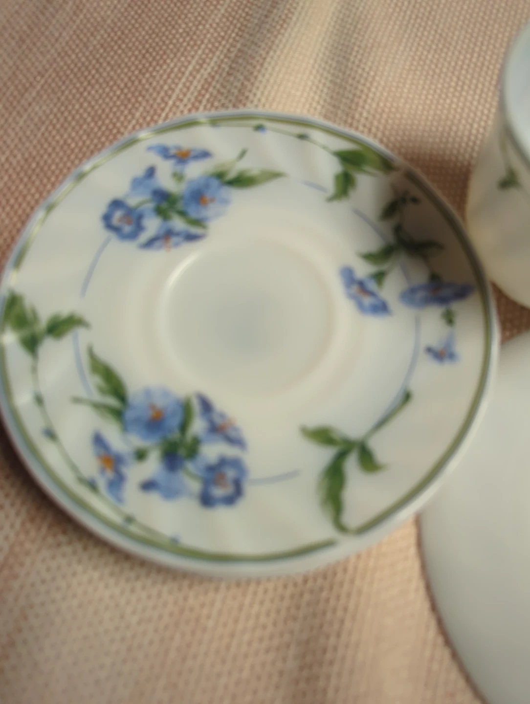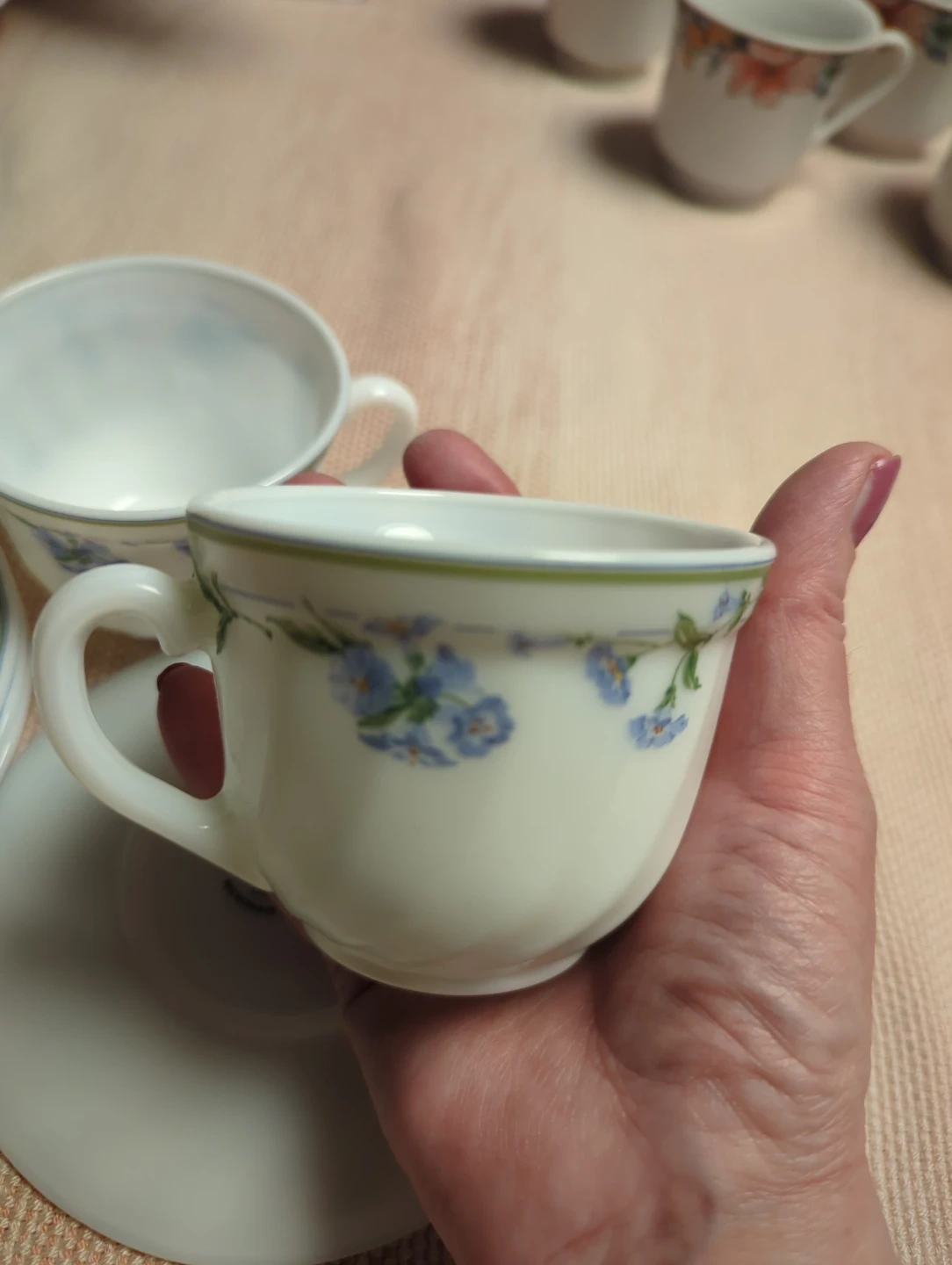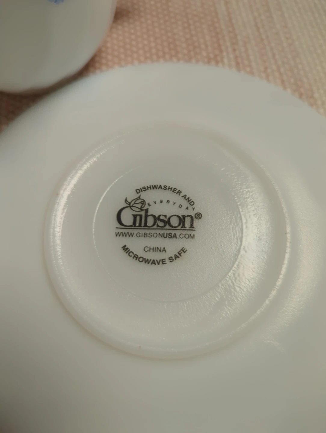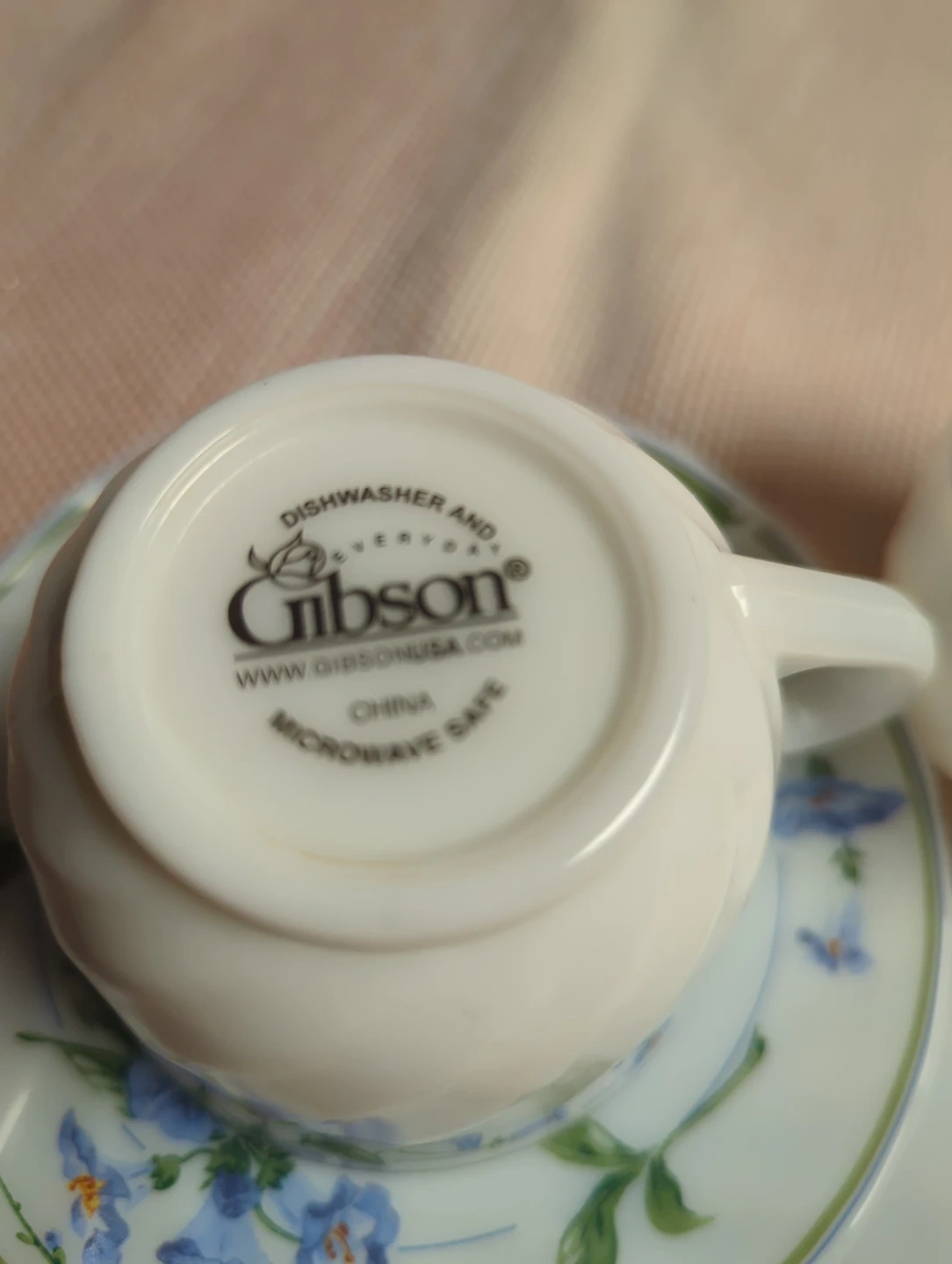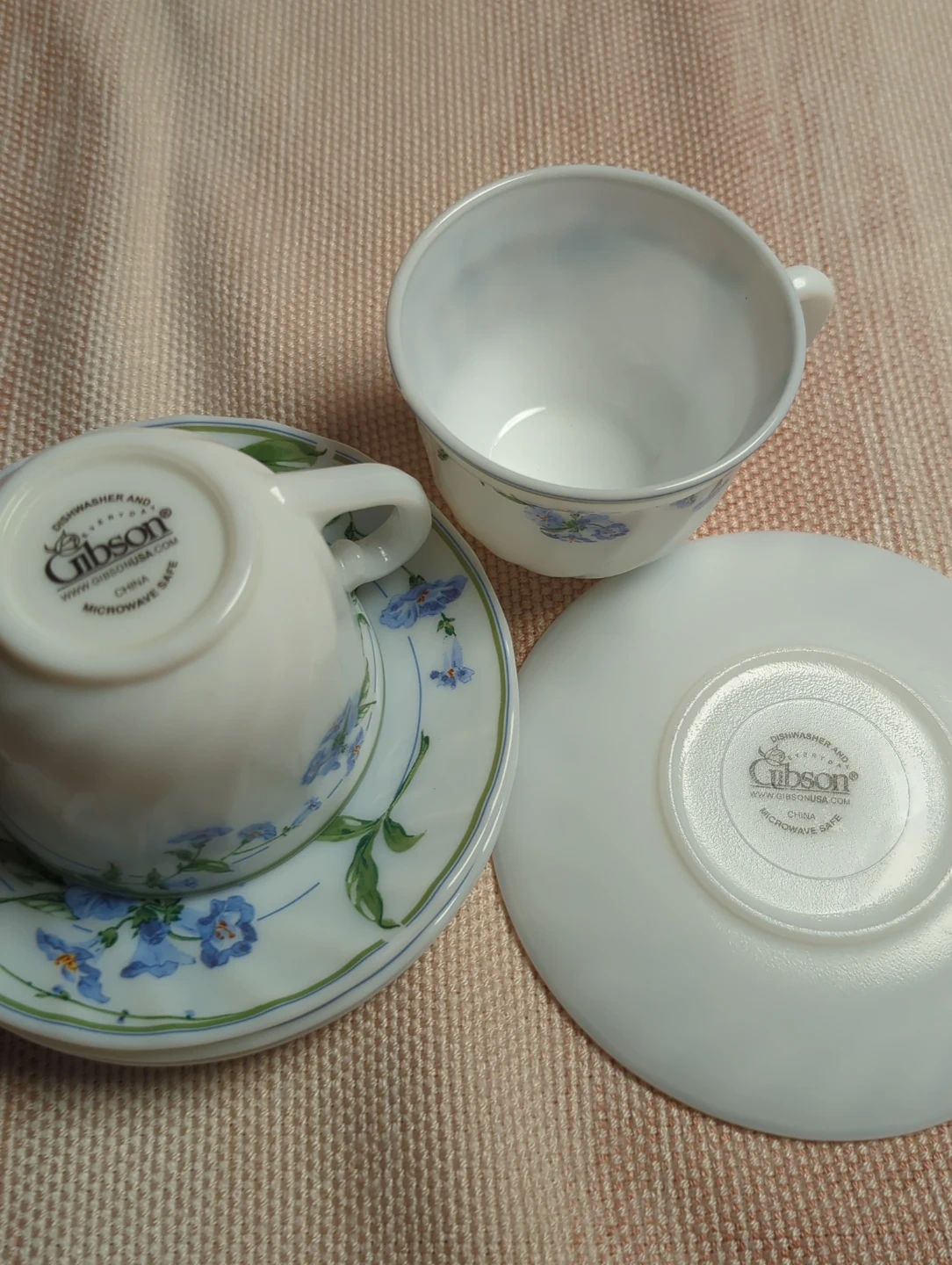 Set of Gibson 2 teacups and saucers with a delicate blue floral design. Microwave and dishwasher safe for everyday use. Dishware made in China.