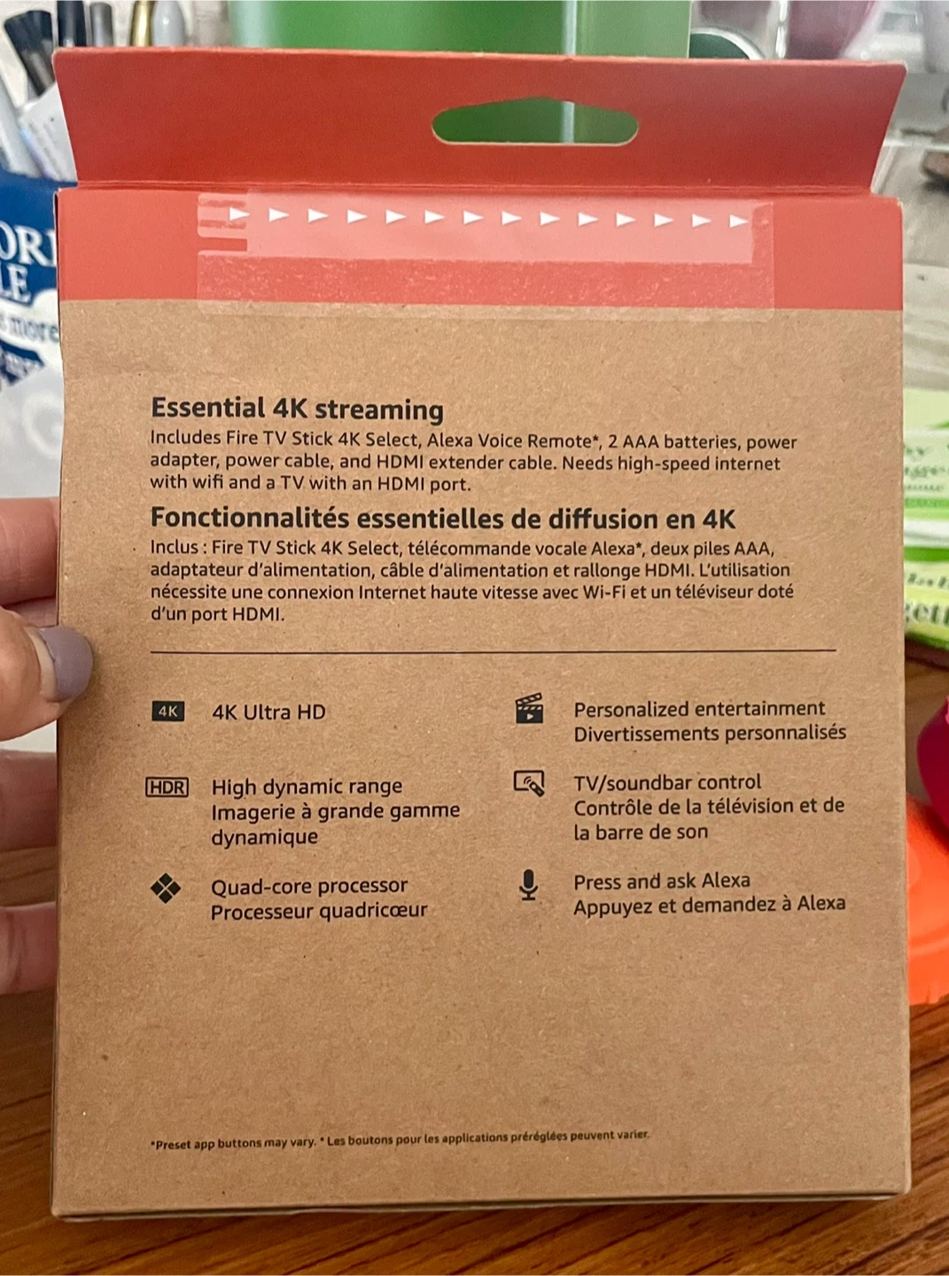 Plug in this Fire TV Stick 4K Select and stream your favourite content. It supports 4K Ultra HD and HDR for a great viewing experience. Includes Alexa Voice Remote and power adapter.
