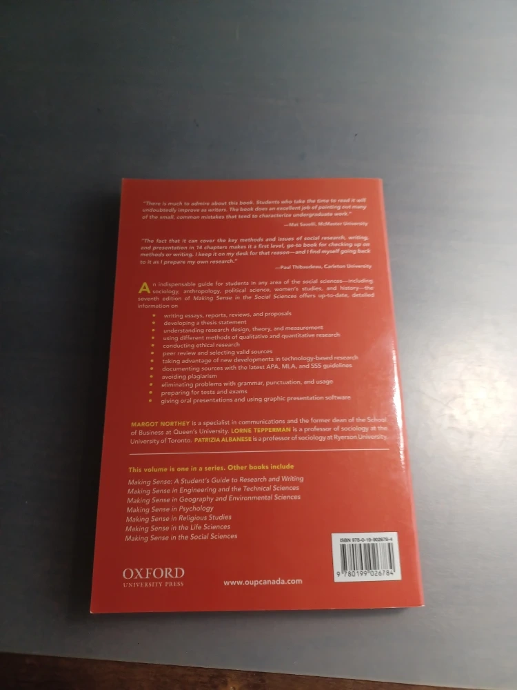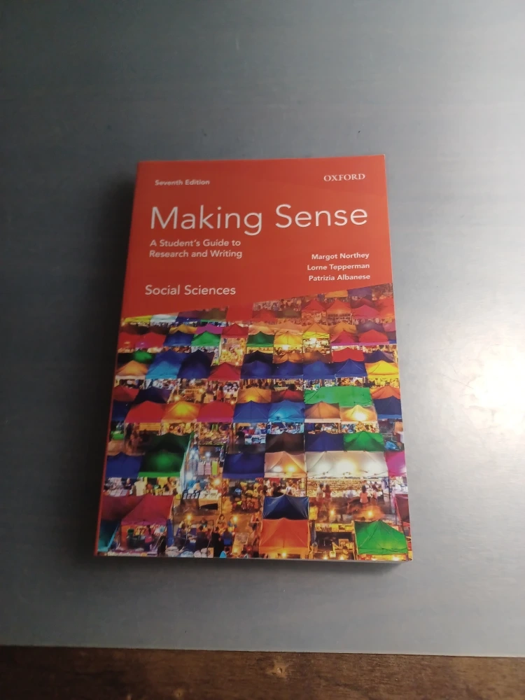 Selling a copy of "Making Sense: A Student's Guide to Research and Writing" 7th edition, by Margot Northey, Lorne Tepperman, and Patrizia Albanese. It's a helpful guide for anyone working on research papers in the social sciences!