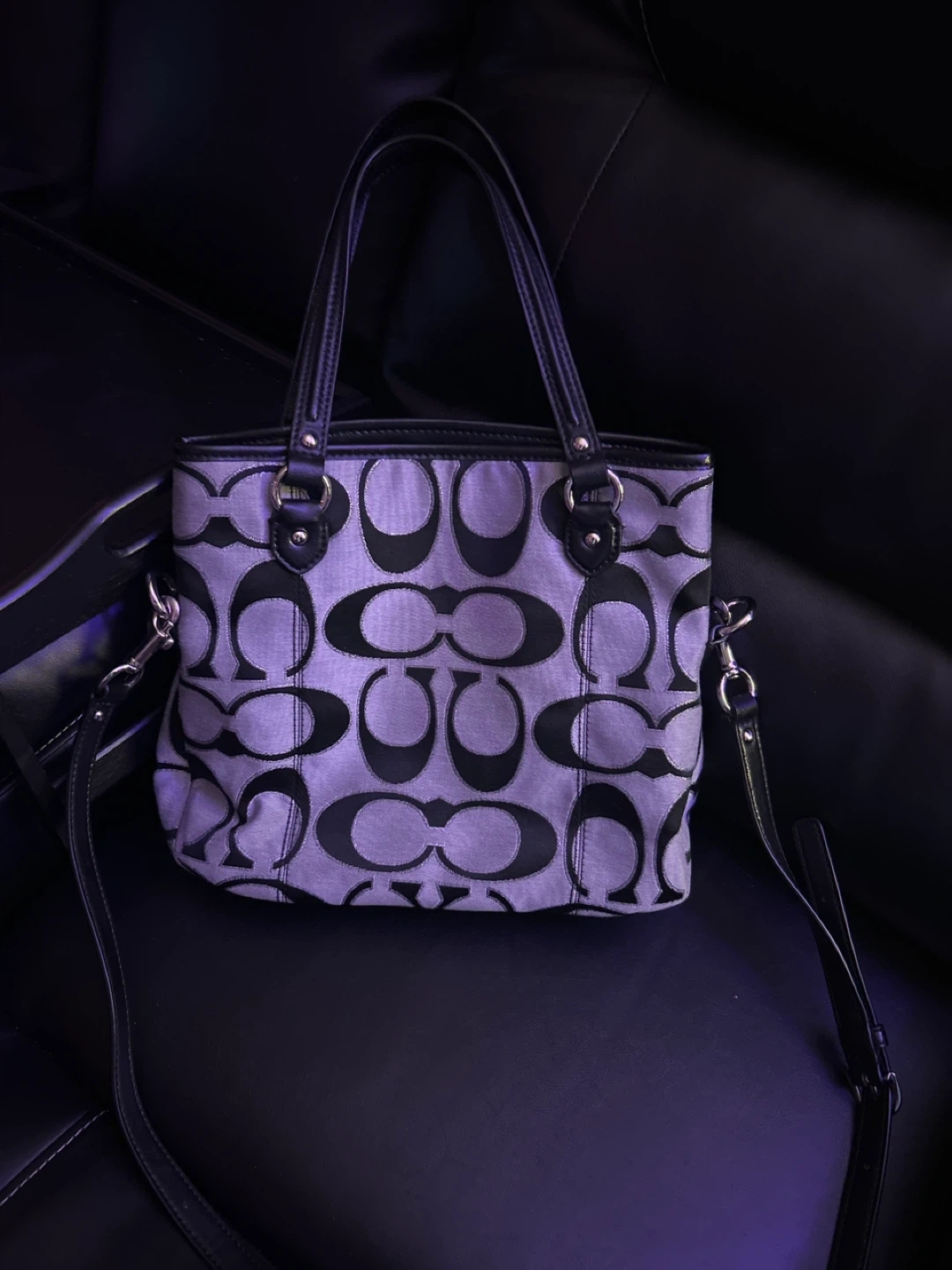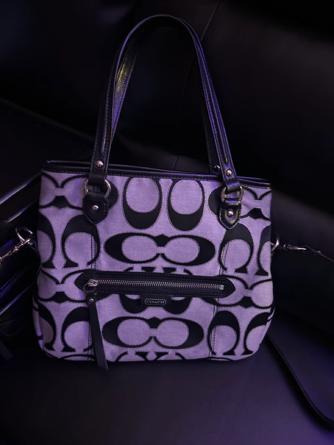 This Coach tote bag features the brand's signature monogram print on canvas with leather trim. It has a zippered main compartment and an interior zippered pocket. The bag includes top handles and a detachable crossbody strap.