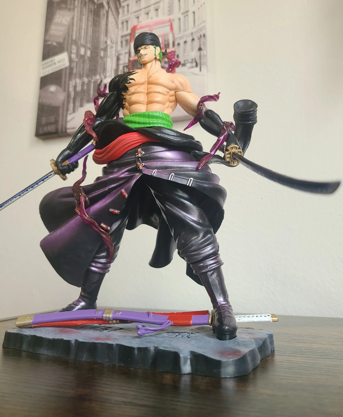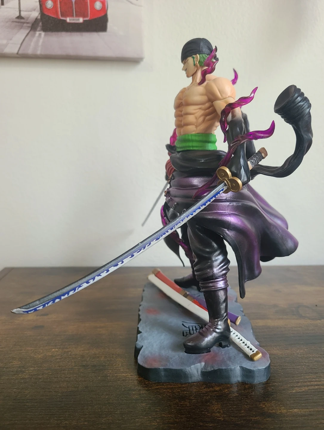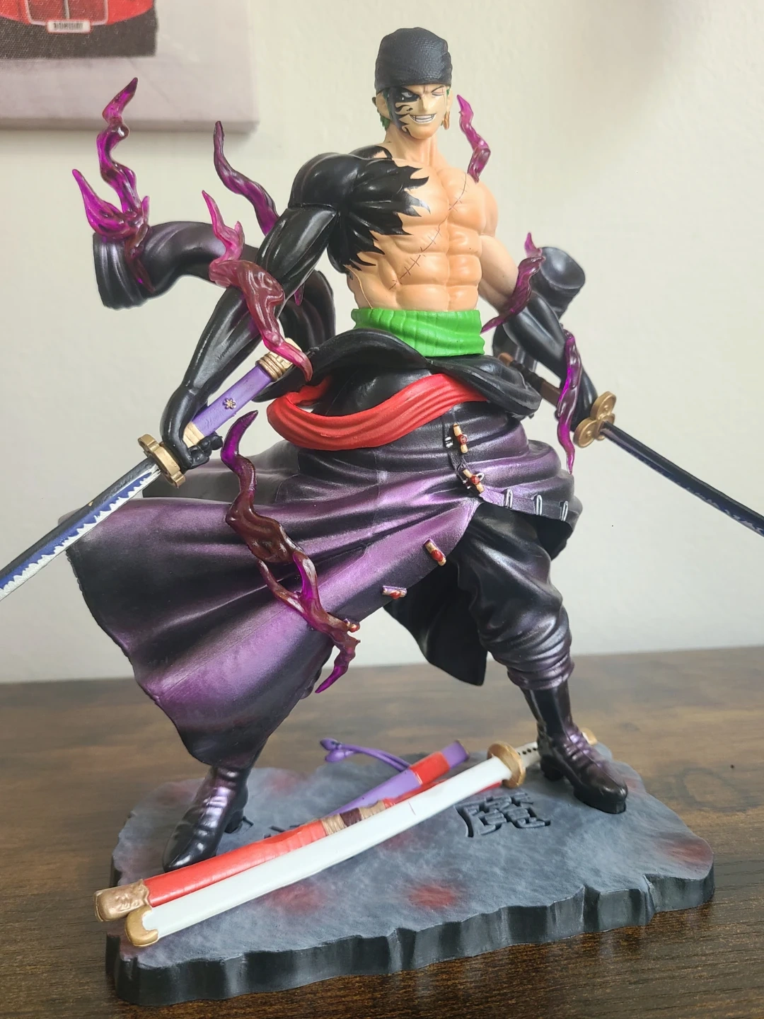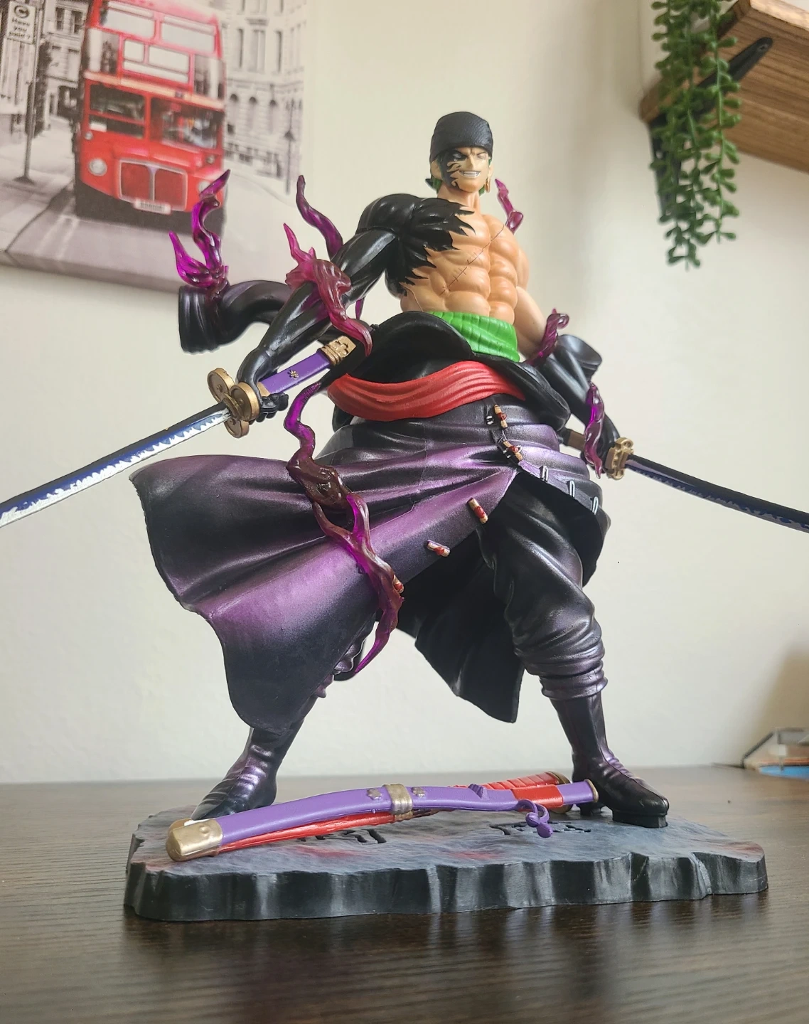This is a Roronoa Zoro figure from One Piece. It depicts him in his battle-ready stance with swords. The figure is made of plastic and features intricate details. The size of the figure is 10 inches