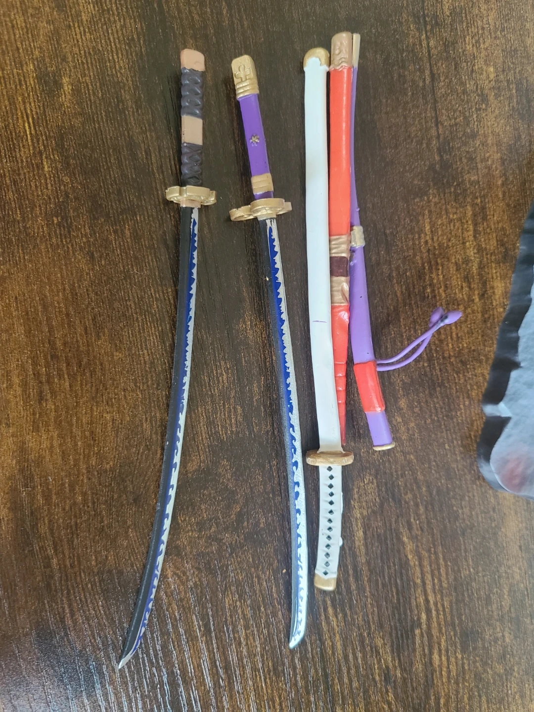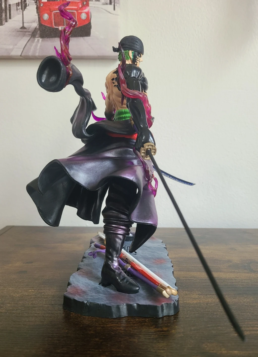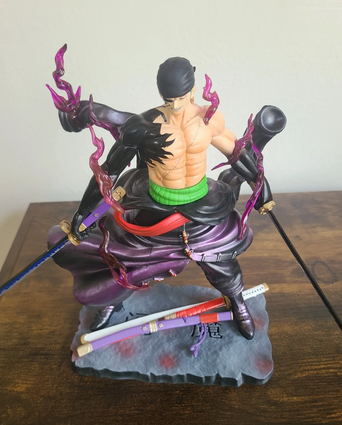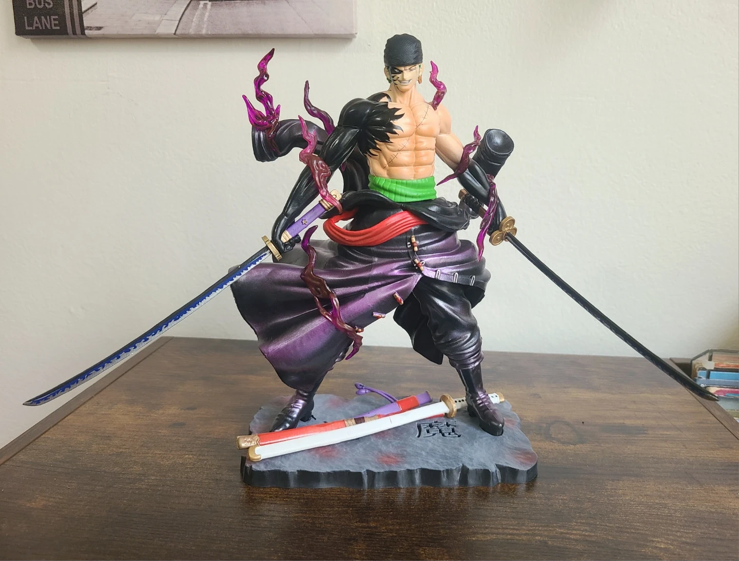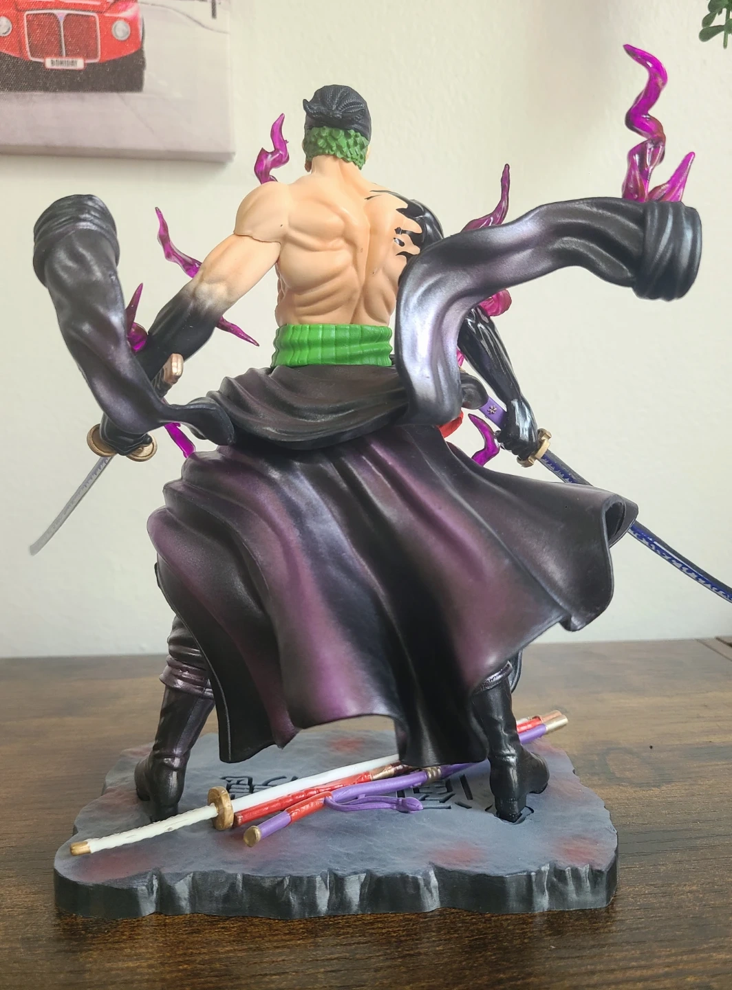 This is a Roronoa Zoro figure from One Piece. It depicts him in his battle-ready stance with swords. The figure is made of plastic and features intricate details. The size of the figure is 10 inches