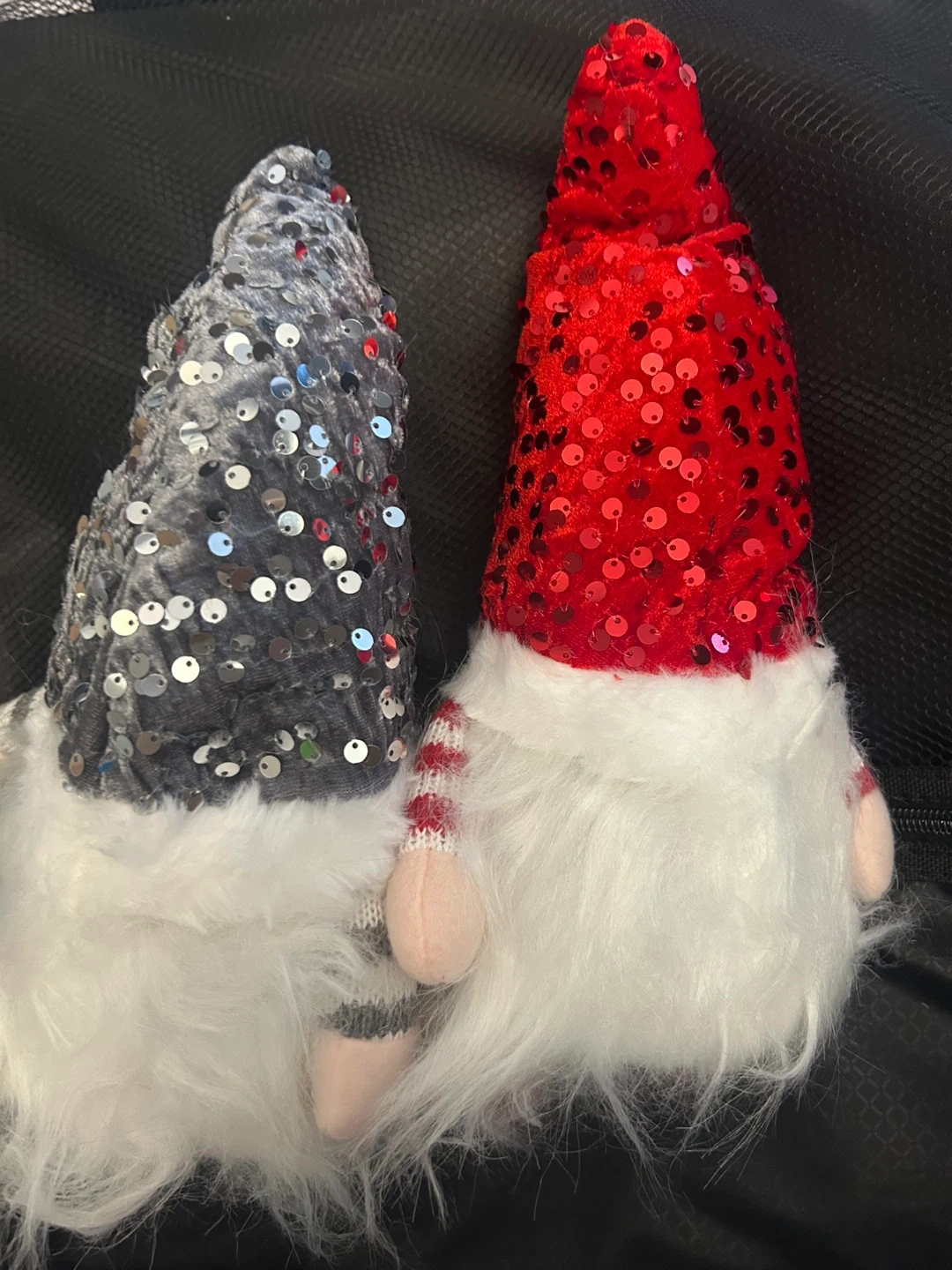 Two festive Christmas gnomes, one with a red sequined hat and the other with a grey sequined hat. They feature soft white beards and striped arm details. These cute decorations are ready to add some holiday cheer!