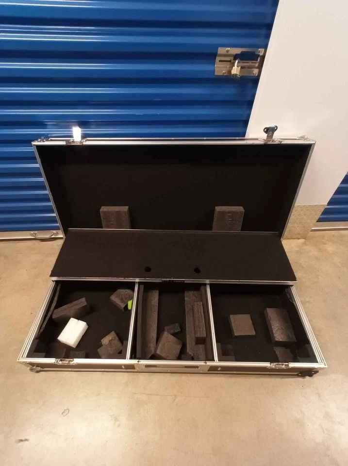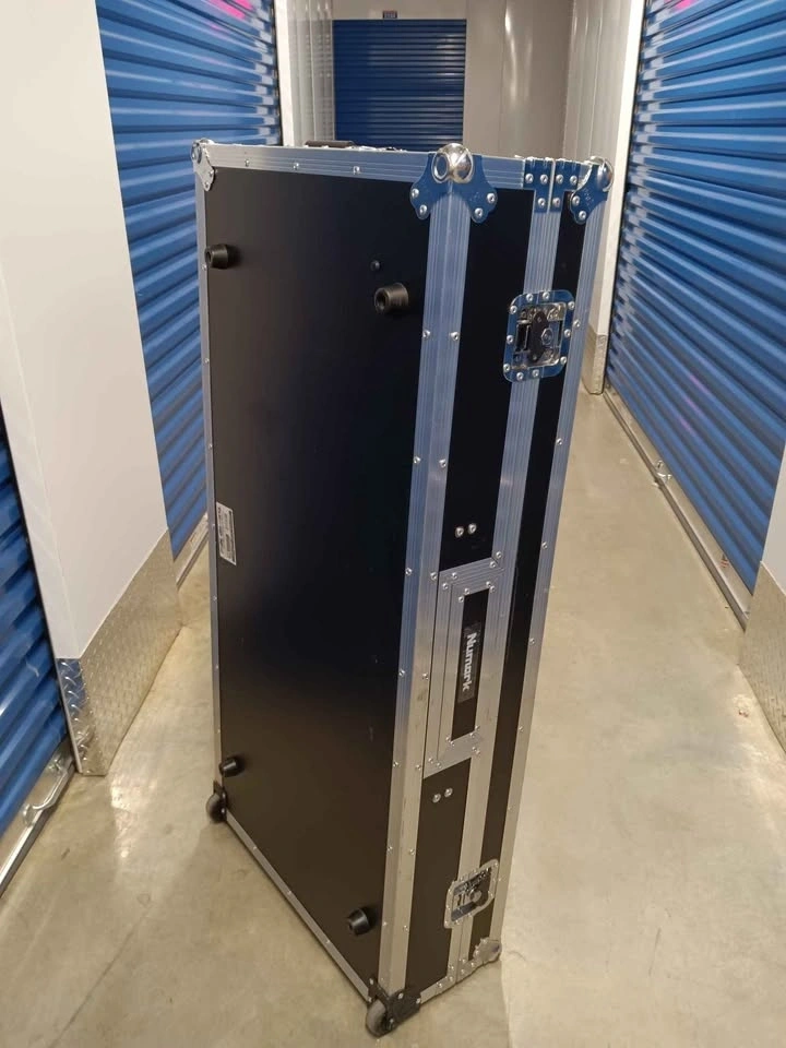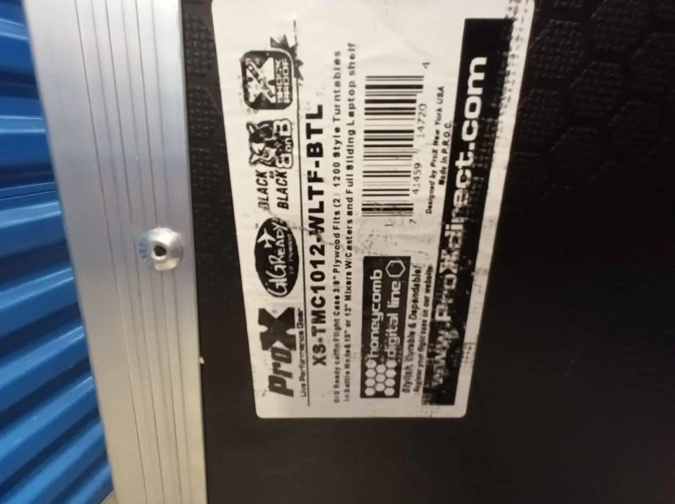 Durable ProX flight case with black honeycomb digital finish and silver aluminum trim. Features recessed spring-action handles and tough rubber wheels for easy transport. Heavy-duty ball corners and industrial-grade butterfly latches provide maximum protection. Interior is designed for Numark DJ controllers. Pick up at CubeSmart storage, 7940 Cooper Avenue, Glendale, New York 11385.