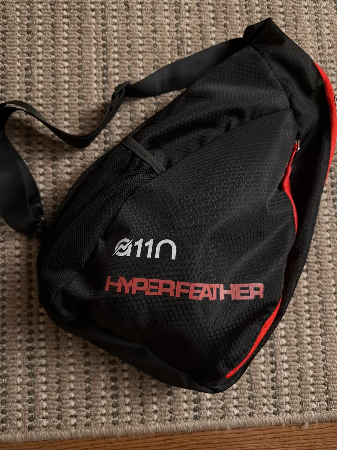 This set includes two 110 Hyperfeather pickleball paddles, three yellow pickleball balls, and a black carrying bag. All in excellent condition.