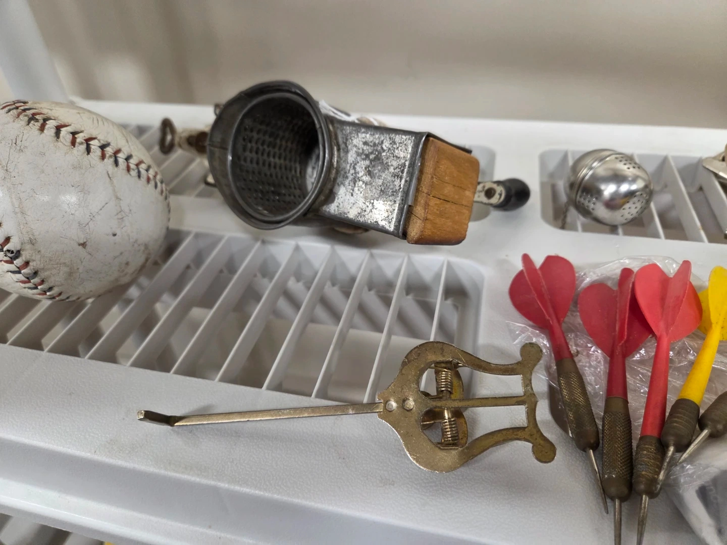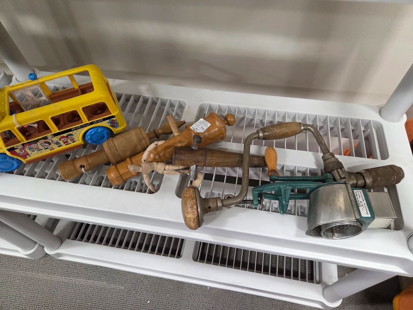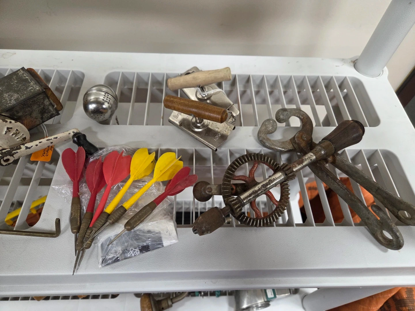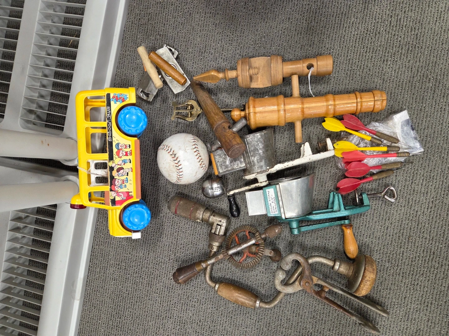 Vintage kitchen items and tools. You get all the gadgets in the photo. Including drills and meat grinders. Vintage darts, spigot for wine / wiskey barell, yellow toy bus, old baseball, part of a yarn spinning wheel, jar openers, a music sheet holder for an unknown instrument and more.