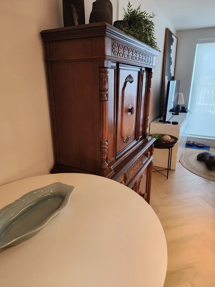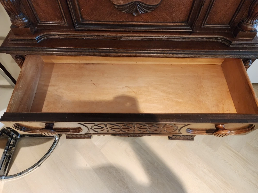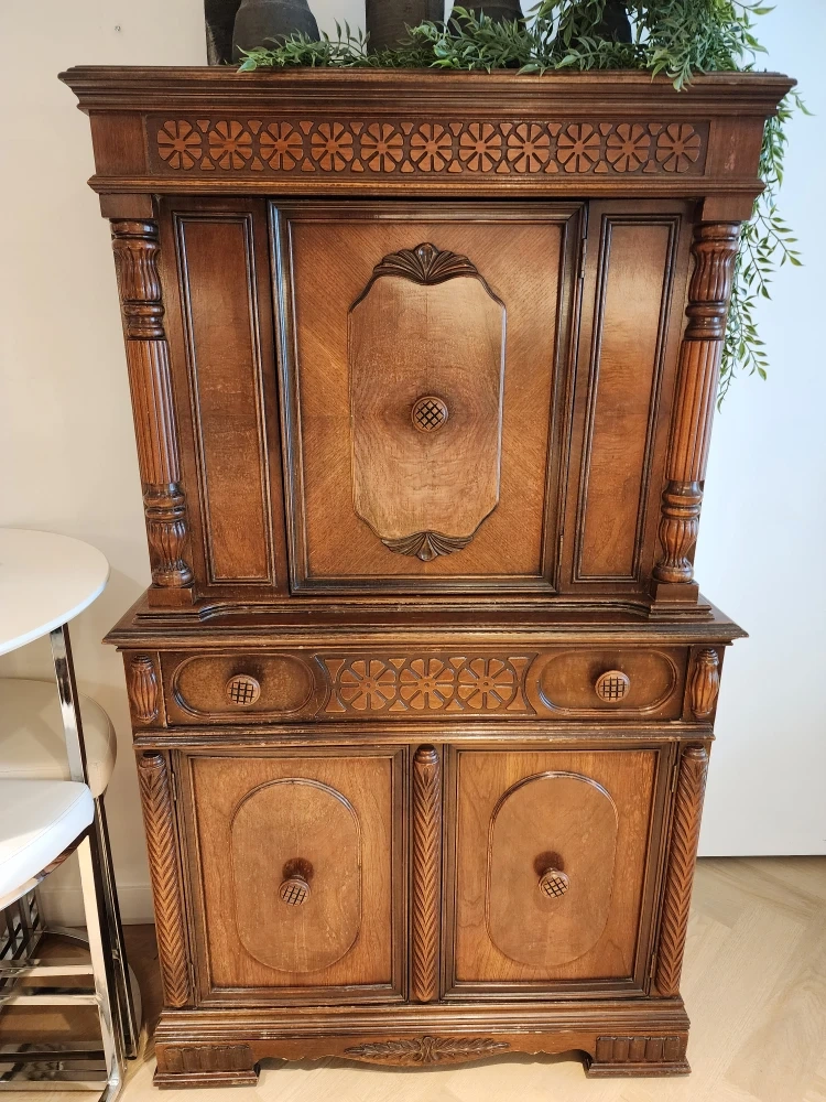 This beautiful china cabinet is crafted from dark wood and features decorative carvings. It has two lower doors, one drawer, and an upper section with shelves behind cabinet doors. A lovely piece for any dining or living space!