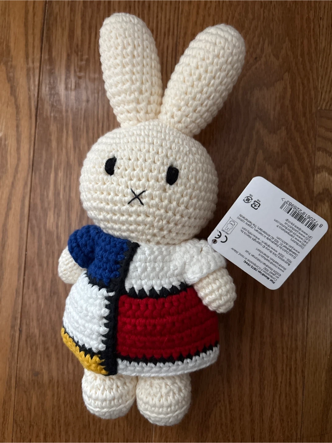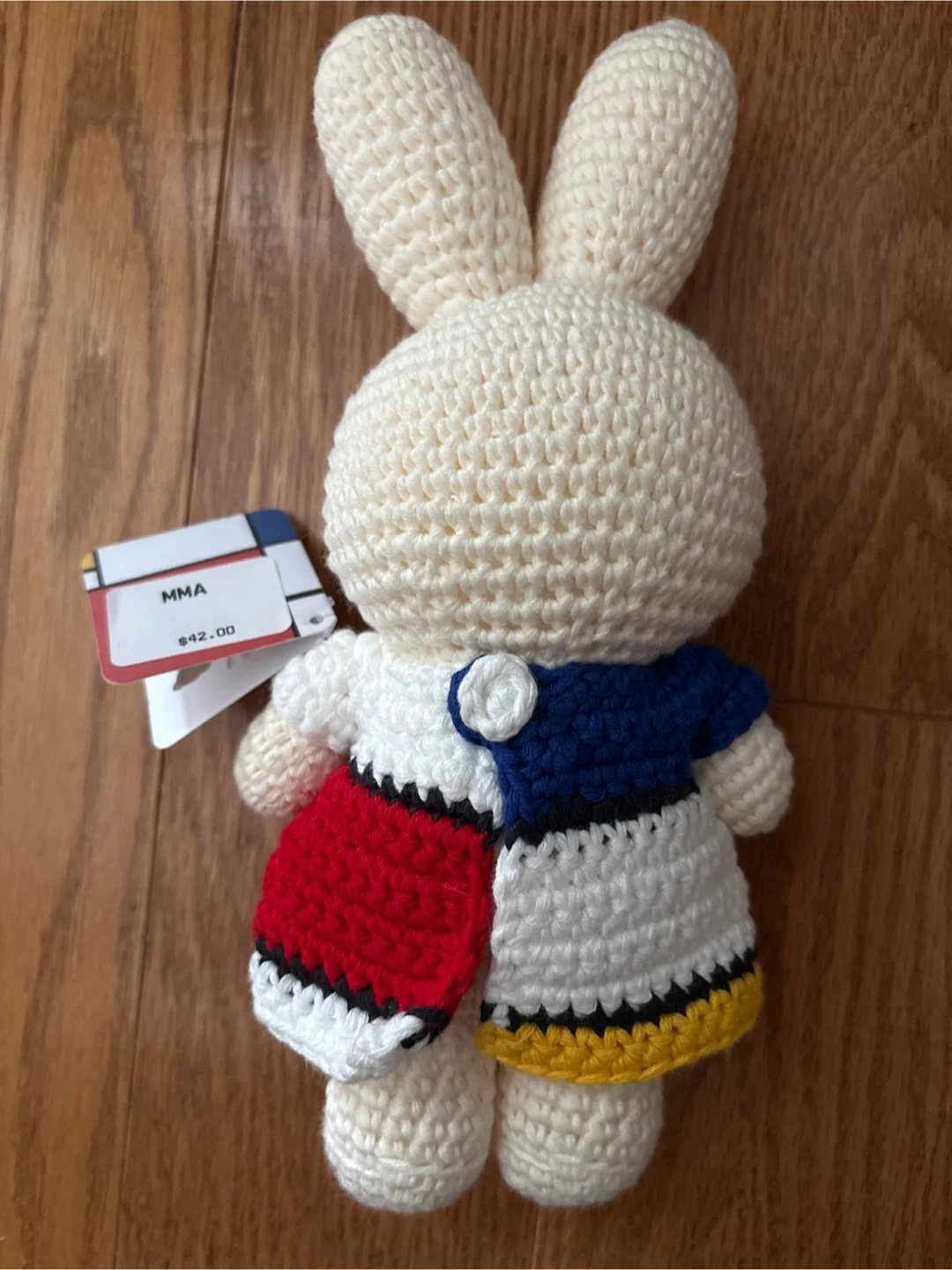 This is a handmade Miffy crochet doll by Just Dutch. It's wearing an outfit inspired by Piet Mondrian's artwork. Made from organic cotton. Great for collectors or as a unique decor piece!