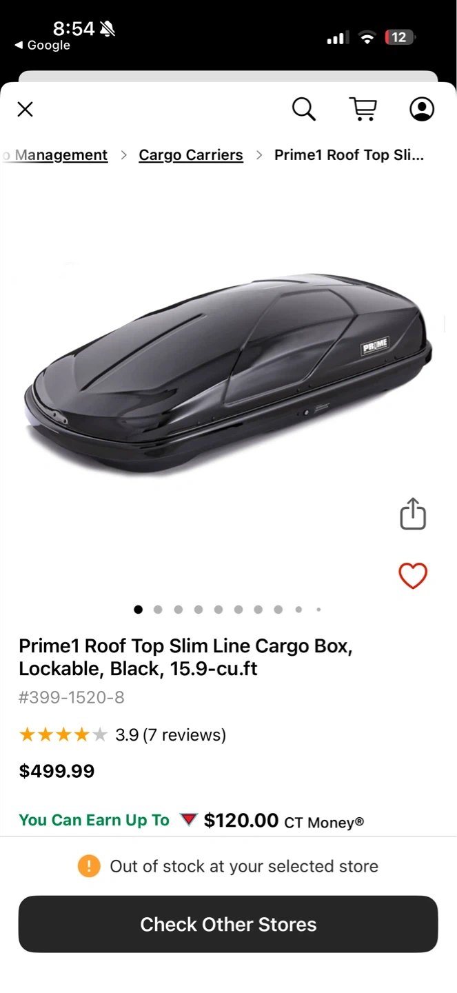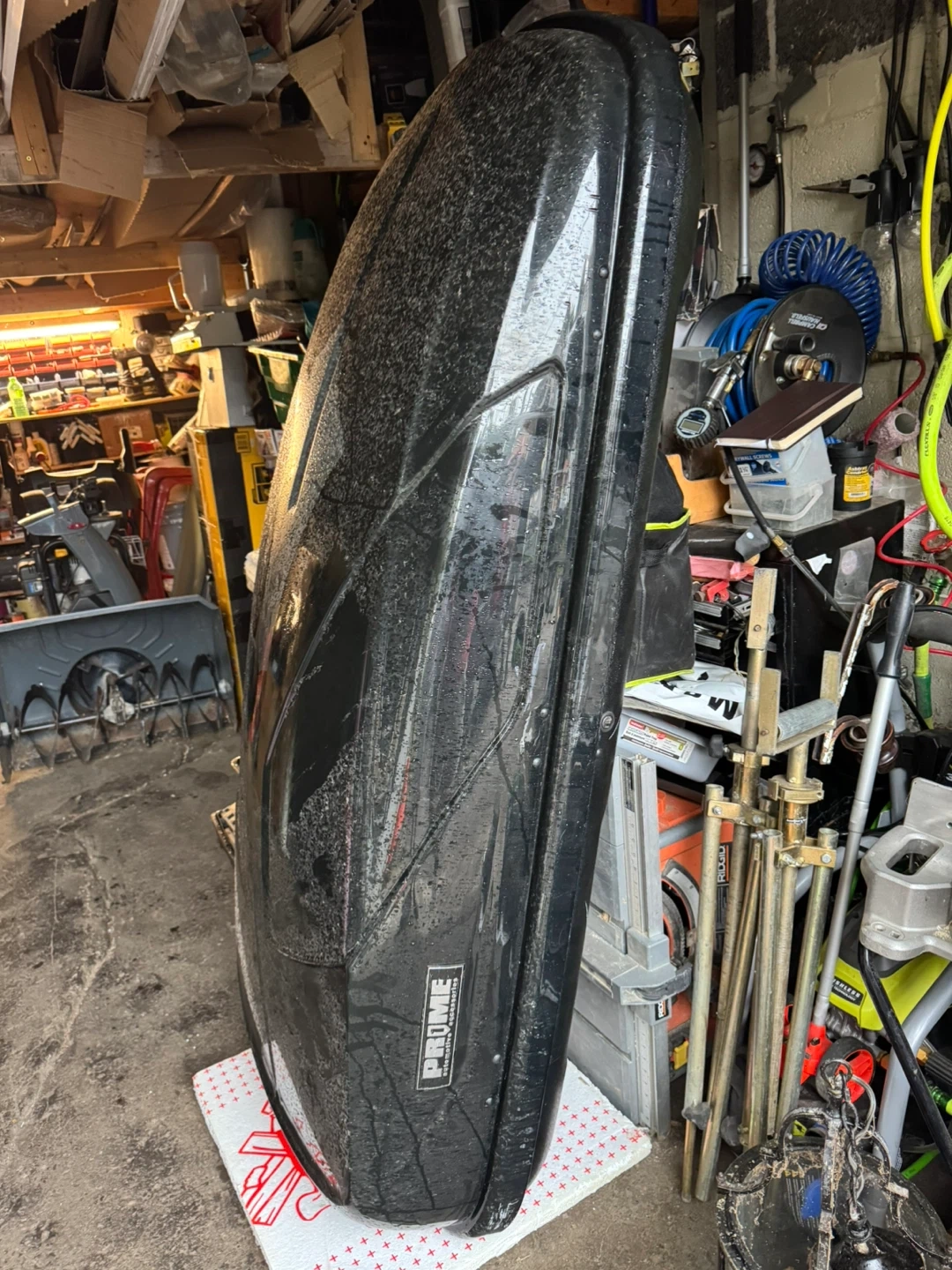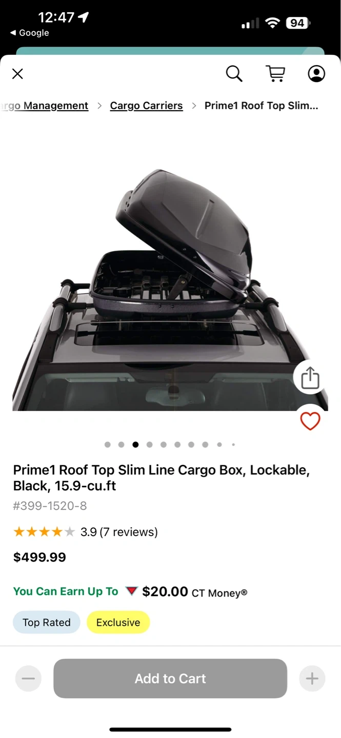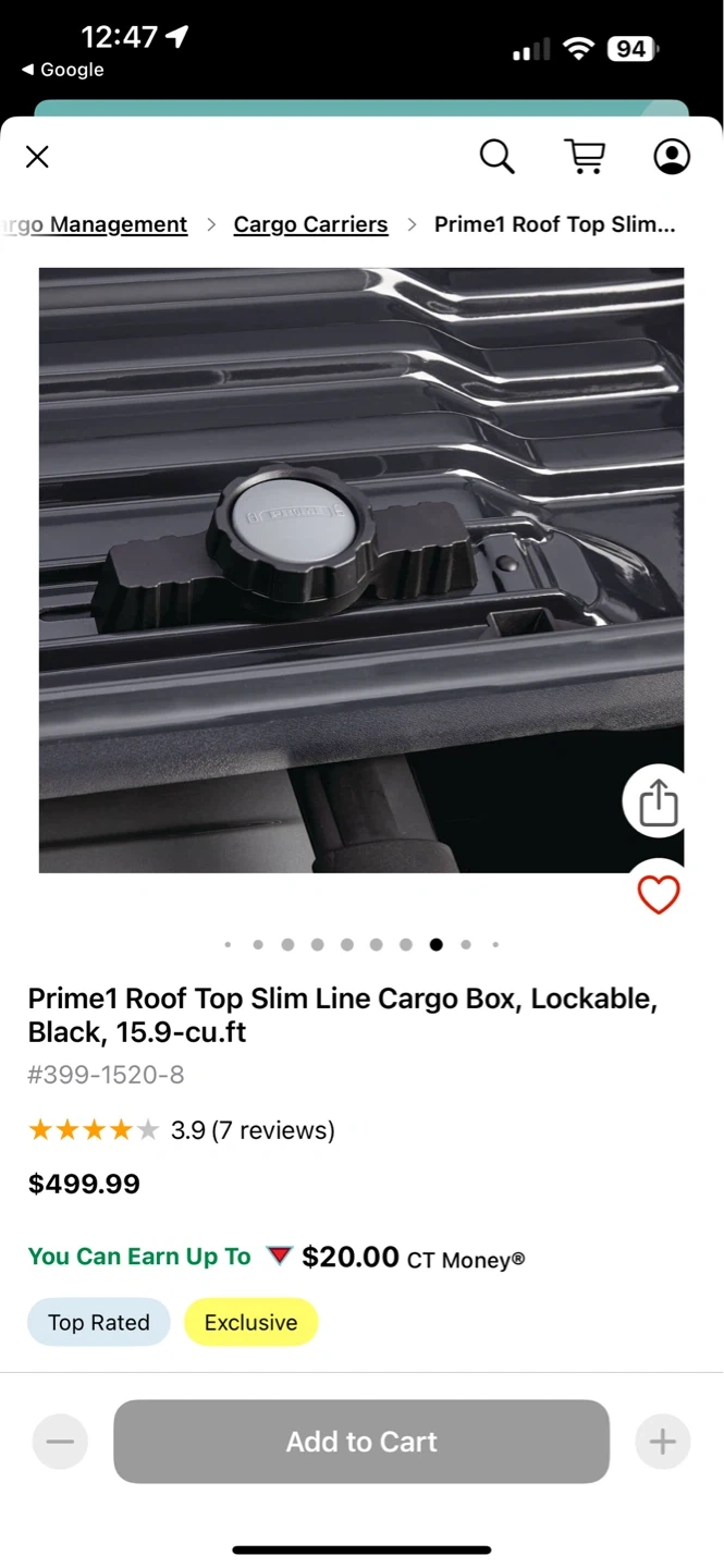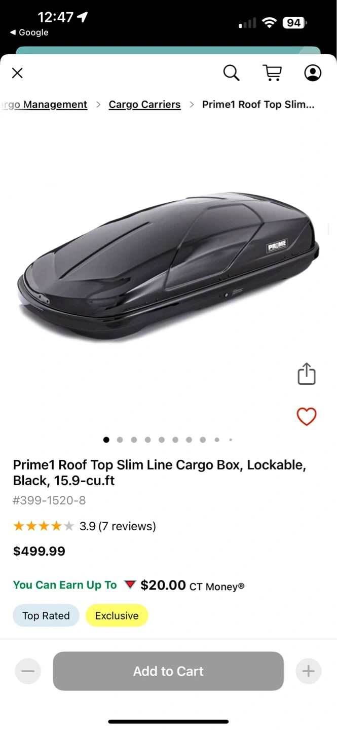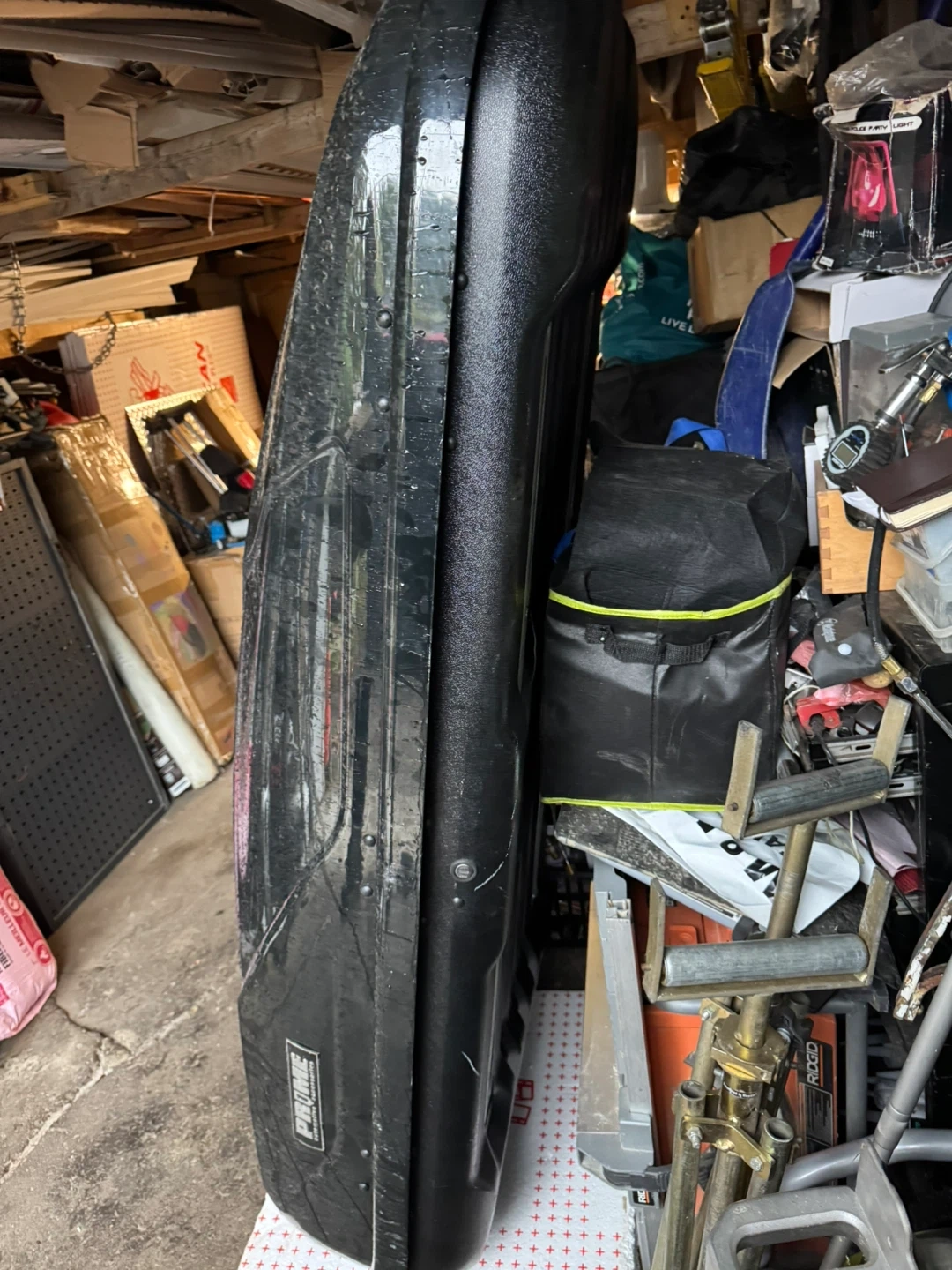 Prime1 Roof Top Slim Line Cargo Box. Lockable design in black. It's 15.9-cu.ft capacity! Perfect for extra storage on road trips.