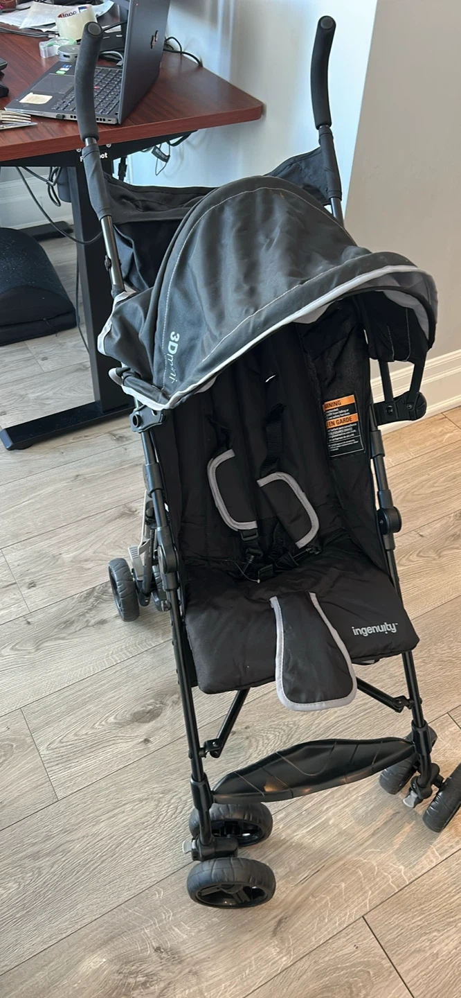 Never used …..This black Ingenuity 3D Mini stroller is a lightweight and compact option for on-the-go parents. It features a durable frame and easy-fold design, making it convenient for travel. The stroller has a comfortable seat with a safety harness.