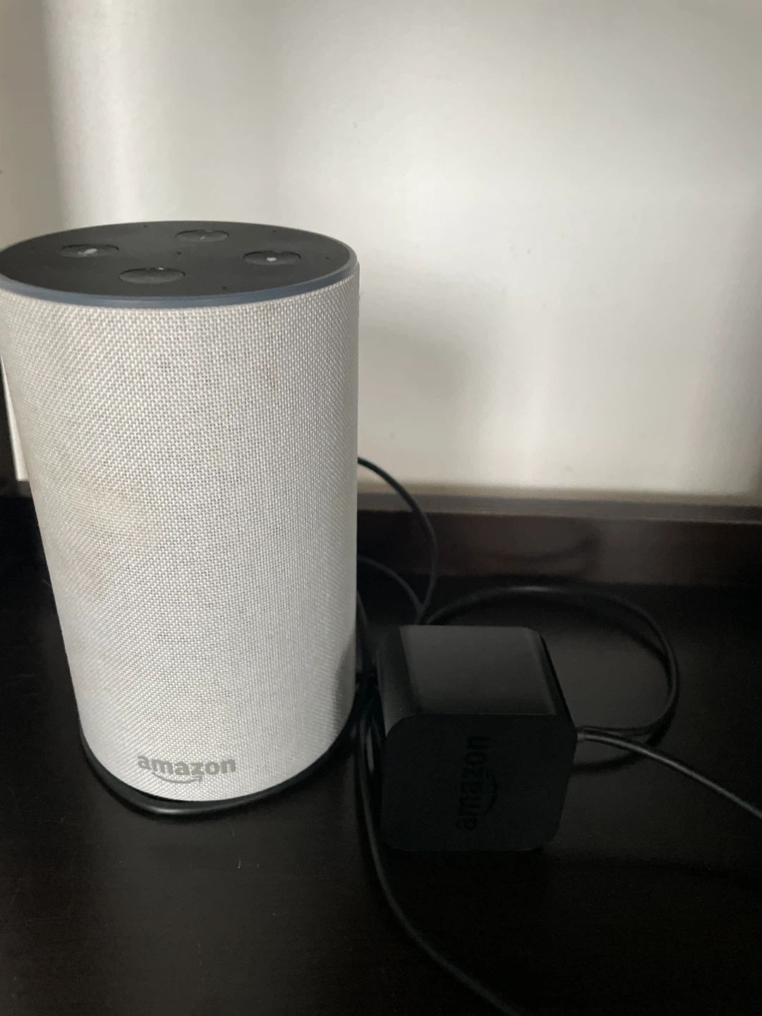 This is an Amazon Echo 2nd Generation smart speaker in Charcoal. It's a smart home device with voice control. Includes power adapter.