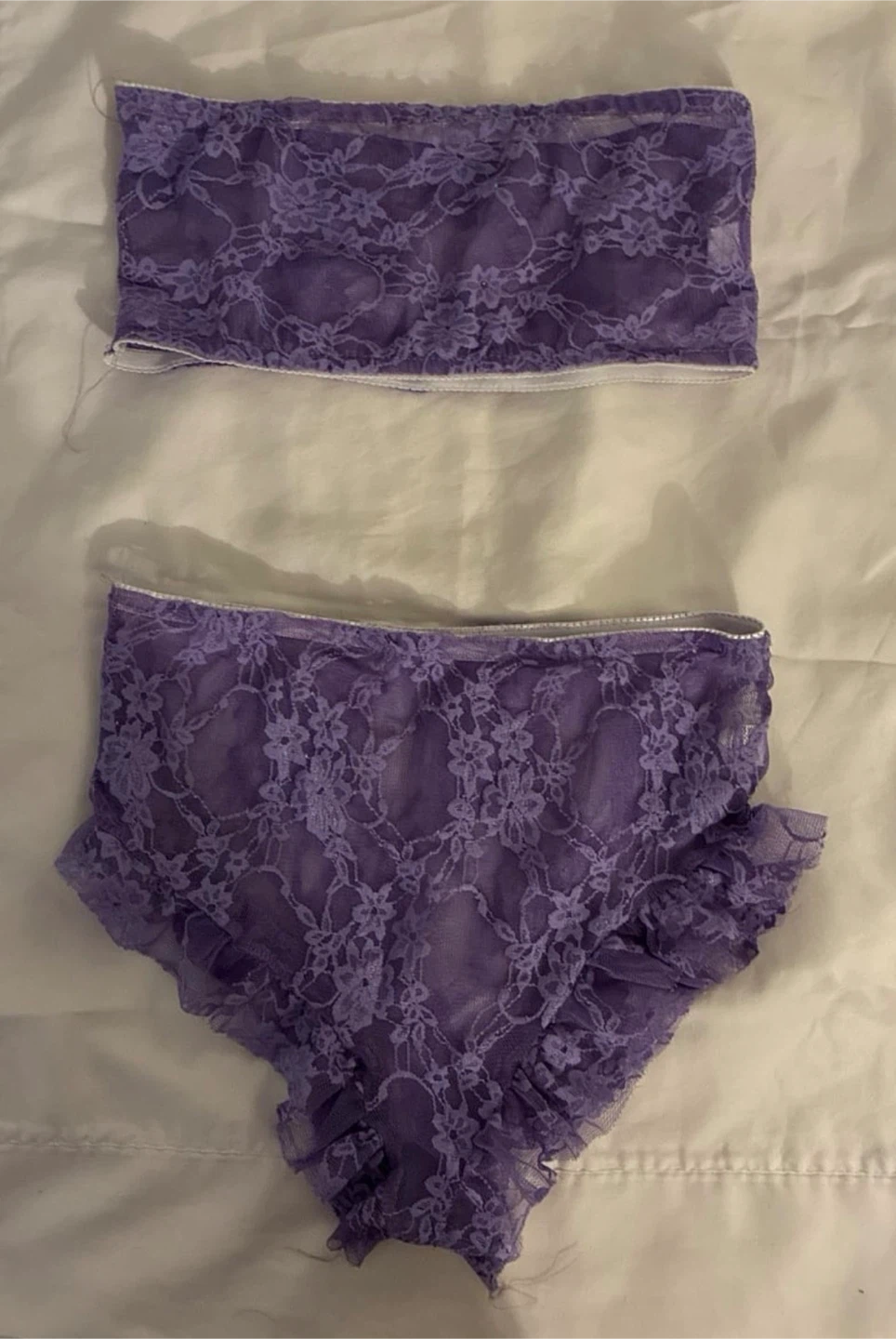 This is a purple lace bralette and high-waisted panty set. It features delicate floral lace patterns and ruffle trim on the bottoms. Material is sheer lace with a white trim.