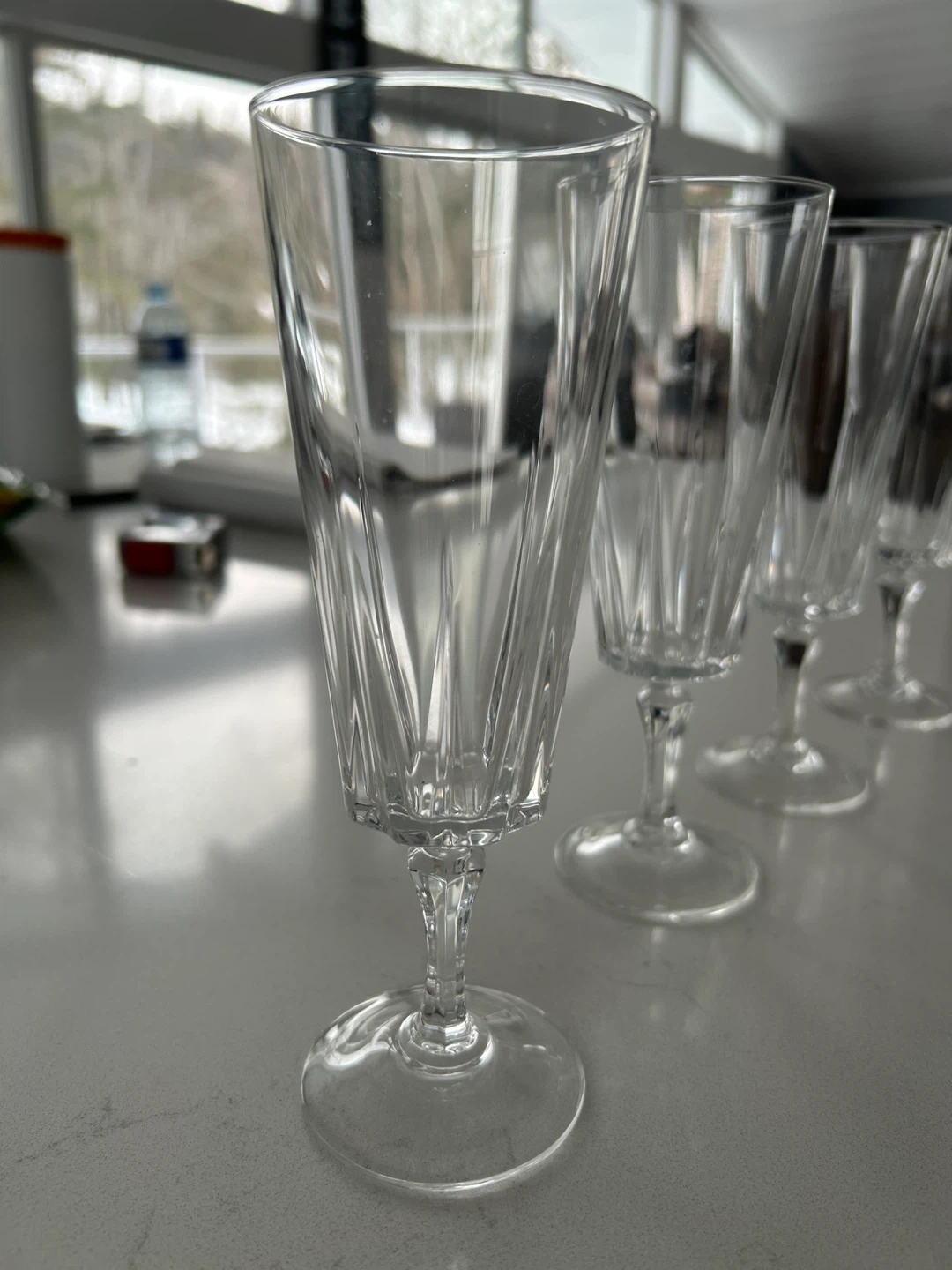 Elegant set of four clear crystal champagne flutes. These glasses have a fluted design on the bowl and a delicate stem. Perfect for celebrations or special occasions!