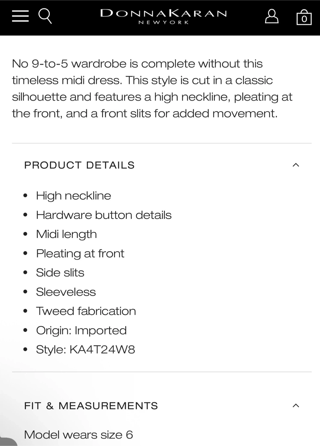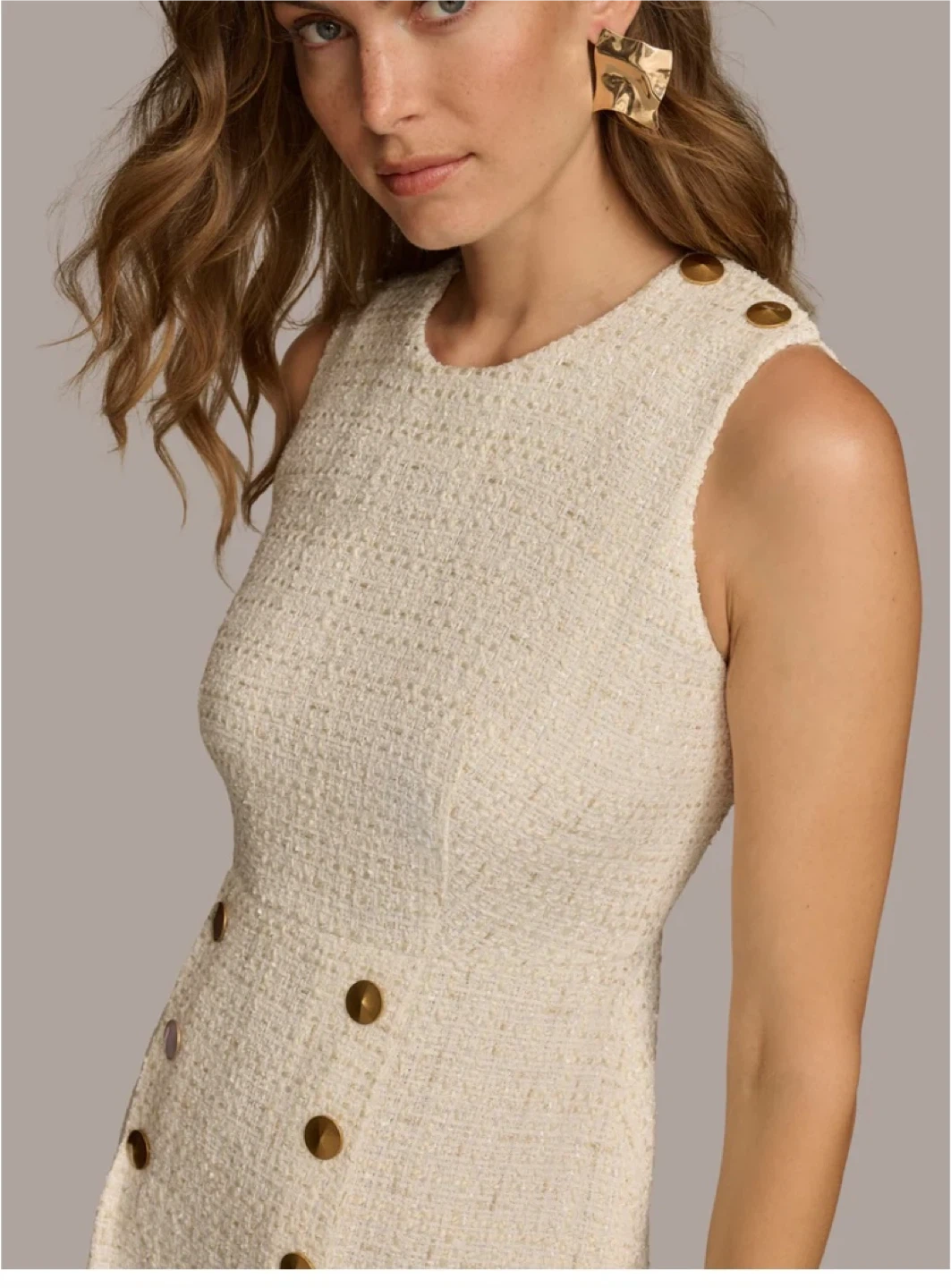 This is a Donna Karan New York sleeveless midi dress. It features a high neckline, hardware button details, pleating at the front, and side slits. The dress is made from tweed fabrication and is a size 6. It has a classic silhouette, perfect for a 9-to-5 wardrobe!