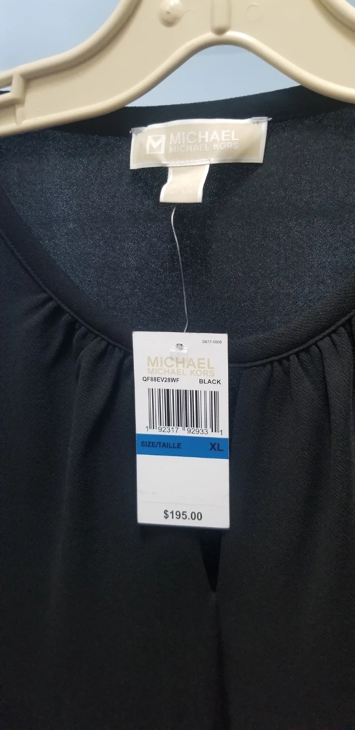 A Michael Kors black dress with unique gold hardware accents on the sleeves. It features a flattering neckline and a flowy silhouette. This stylish dress is perfect for an evening out! Size XL brand new with tags never worn original price $195.00.