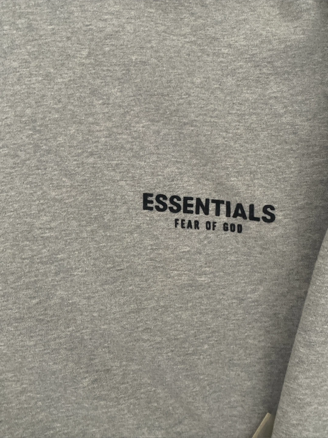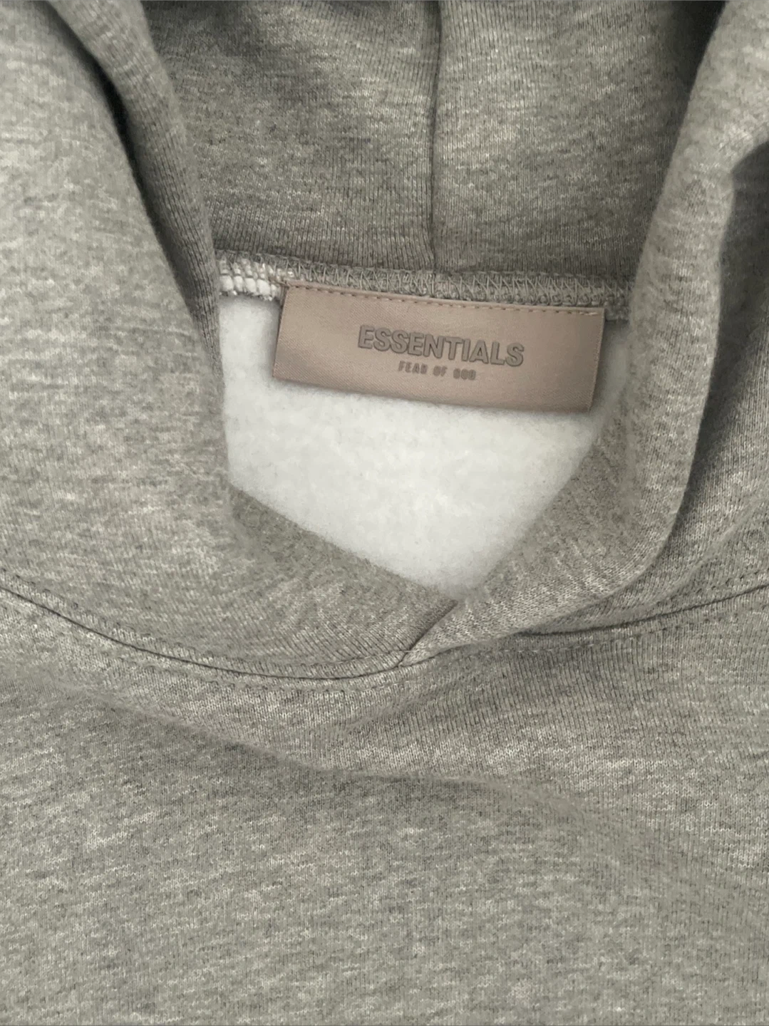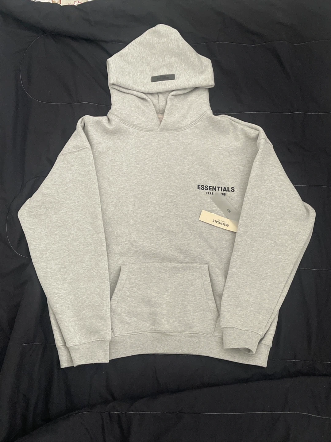 brand new Essentials Fear of God hoodie! It's a comfy grey colour and has the Essentials logo on the front and back. Perfect for staying cozy!
