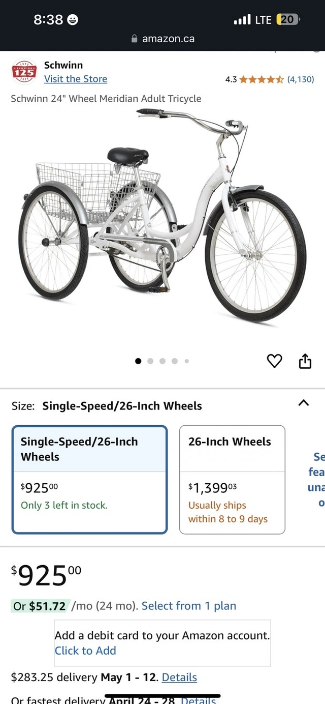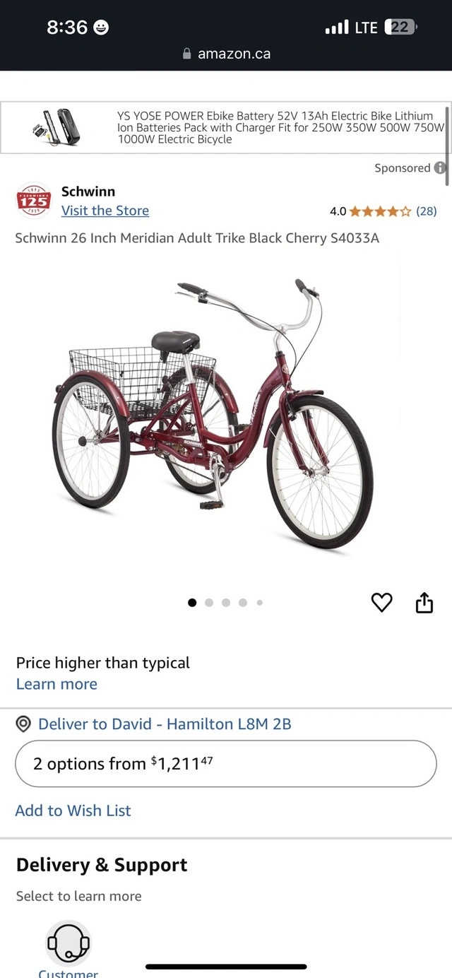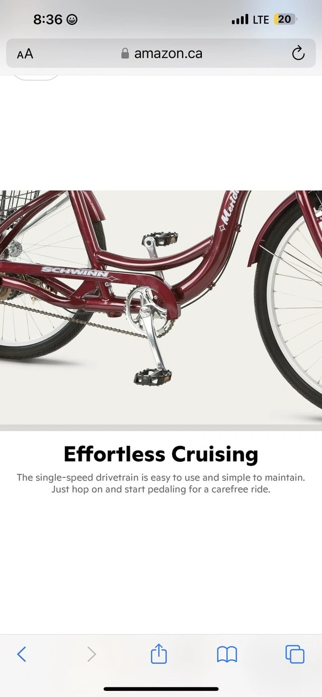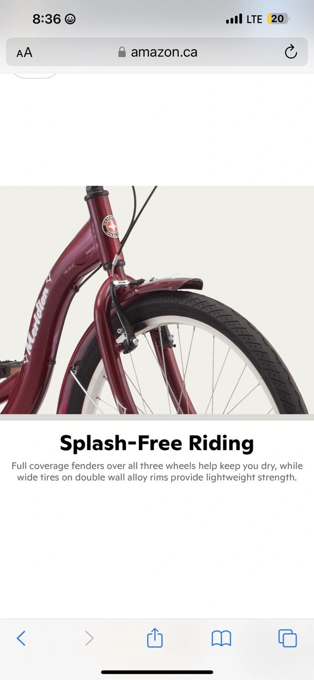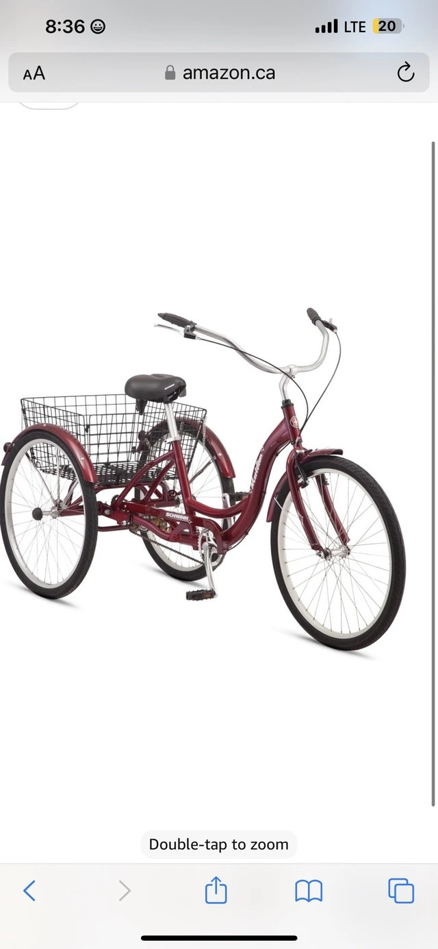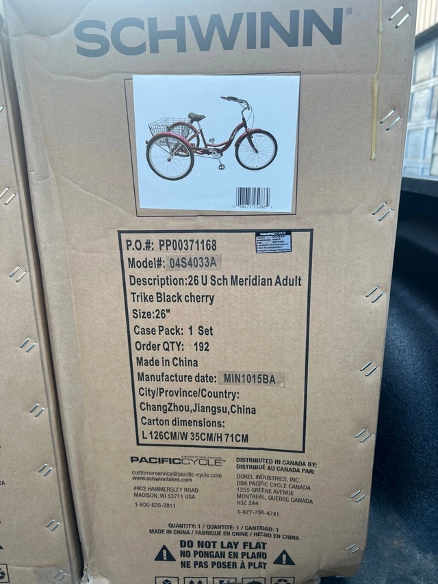 Brand new Schwinn 26 Inch Meridian Adult Trike in Dark Cherry. Retail price is $800 and up. Asking $330 (reduced from $350). Assembly is available for an additional $30; a deposit is required in advance for assembly. This is a quality Schwinn trike built to last, unlike cheaper alternatives. Features a super low step-through aluminum frame, 26-inch wheels (fits riders 64-74 inches tall), classic swept-back handlebars for an upright riding position, full wrap fenders, and a convenient rear basket for cargo. Includes a front V-brake and rear band brake for reliable stopping power, and an adjustable springer cruiser seat for a comfortable ride.