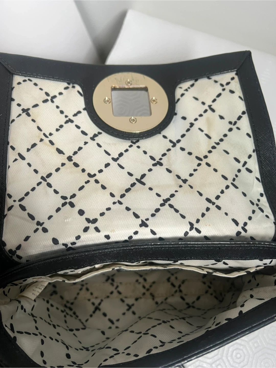 This is a black Kate Spade crossbody bag. It's made of textured leather with a gold-tone turnlock closure and a chain strap. The interior lining has a polka dot pattern.