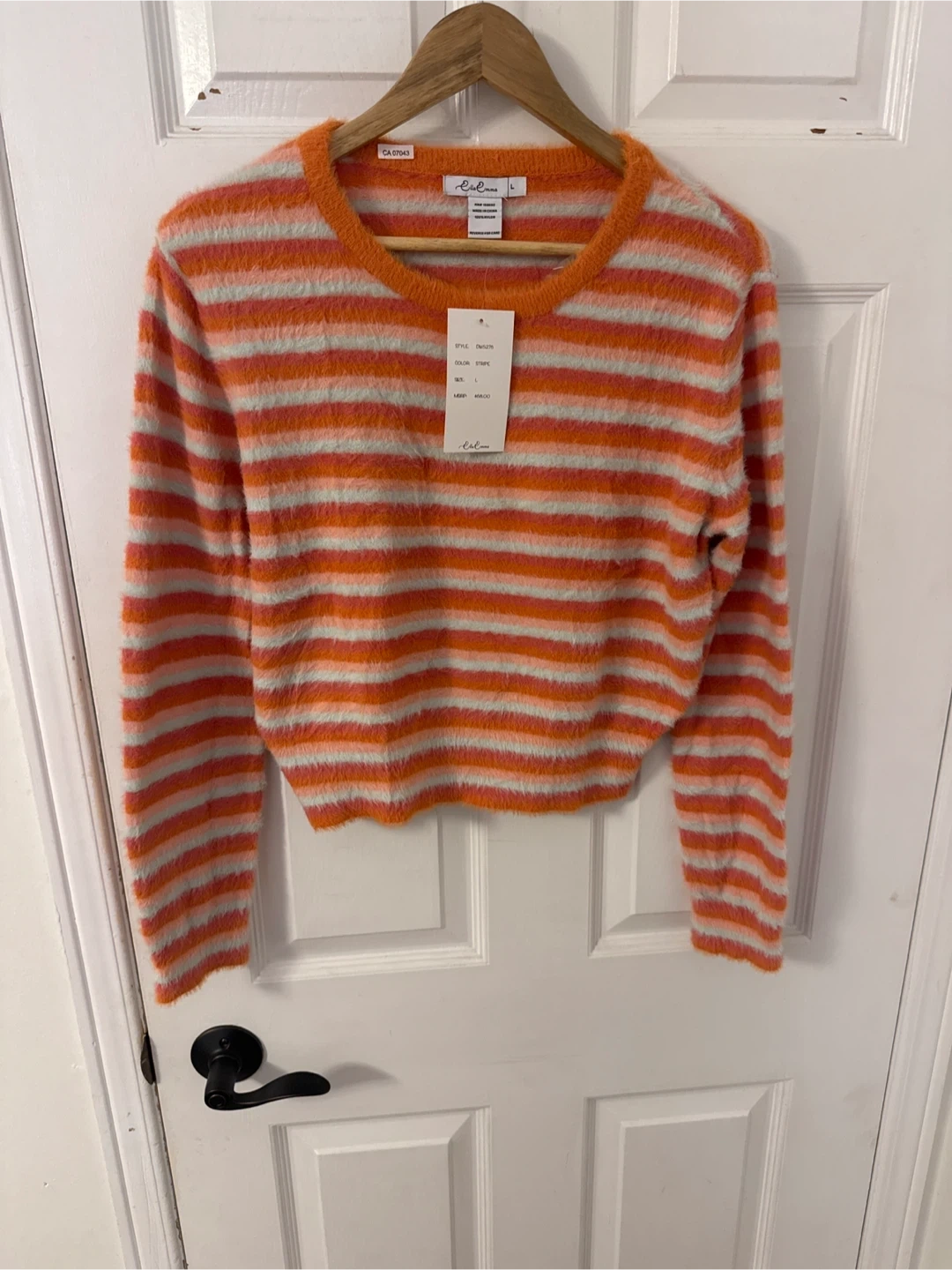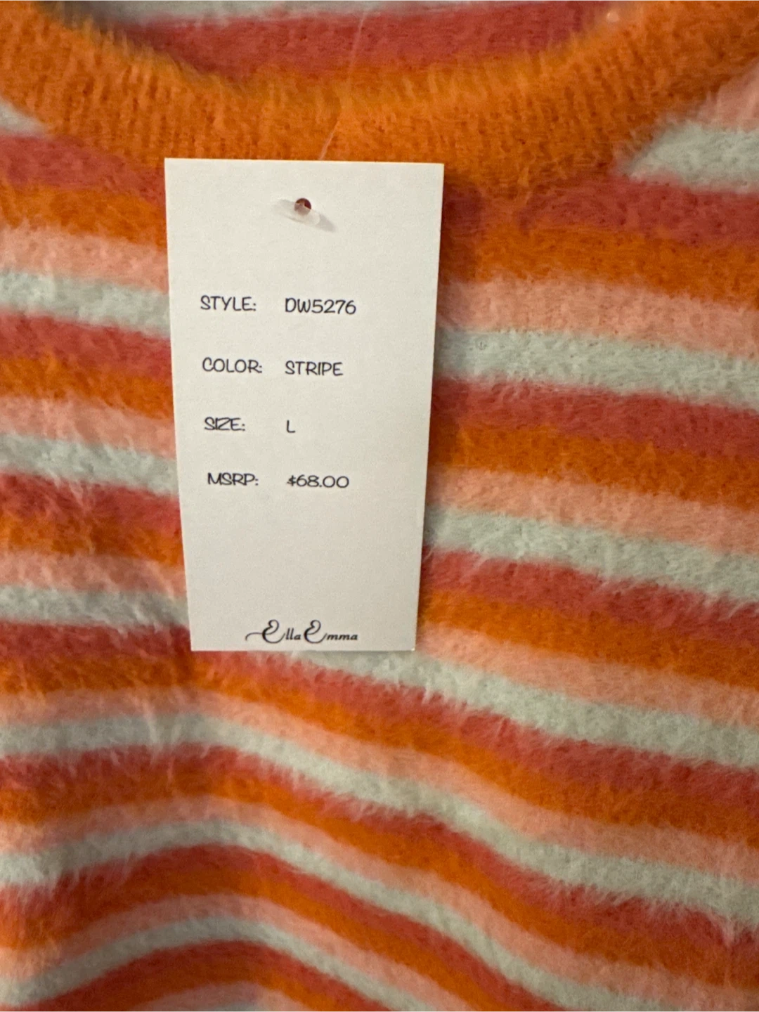 This Ella Emma sweater features a fuzzy knit with an orange and white stripe pattern. It's a size large. Perfect for adding a pop of colour to your wardrobe!